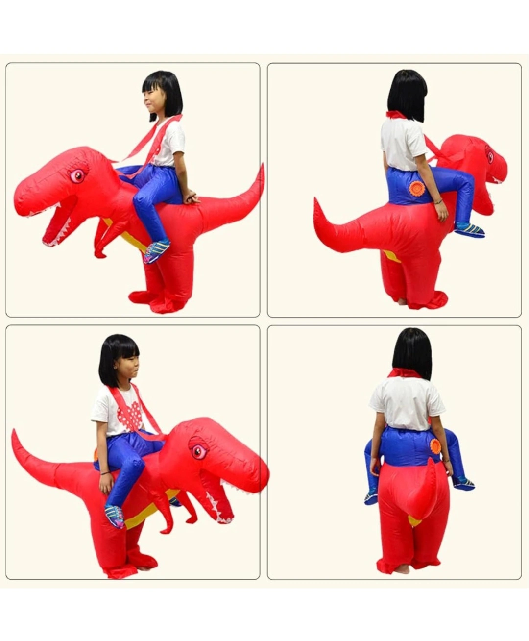 Get ready for some fun with this inflatable dinosaur costume! It's designed to fit most kids age between 3 to 6 and features a cartoon shape with cute teeth. The costume has a fixed drawstring, elastic cuffs, and a built-in pocket. It also includes a blower port for easy inflation. Perfect for Halloween or dress-up!