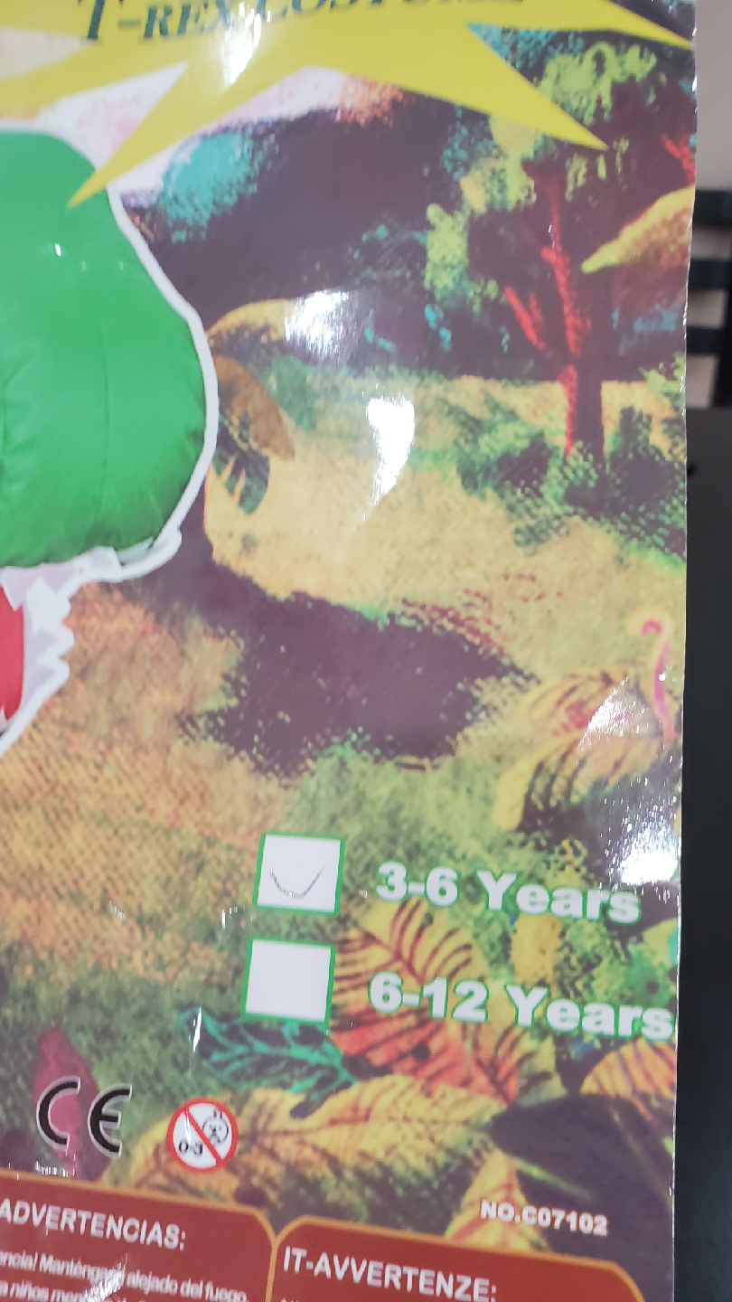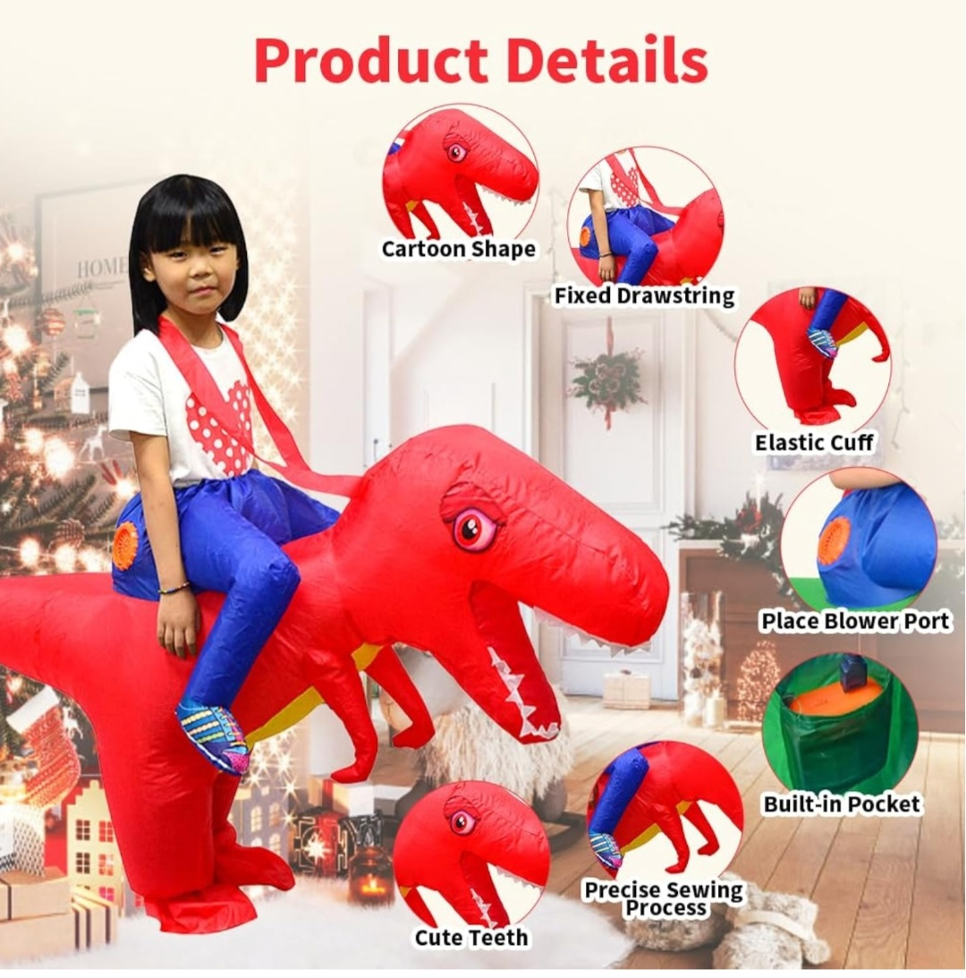 Get ready for some fun with this inflatable dinosaur costume! It's designed to fit most kids age between 3 to 6 and features a cartoon shape with cute teeth. The costume has a fixed drawstring, elastic cuffs, and a built-in pocket. It also includes a blower port for easy inflation. Perfect for Halloween or dress-up!