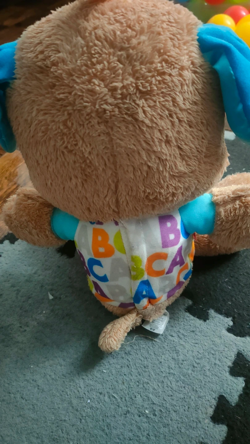 This Fisher-Price Laugh & Learn Smart Stages Puppy is a soft, plush toy designed for learning. It has buttons on its paws that play music and teach about hands. The puppy's tummy features colorful letters spelling out "ABC". It's a great companion for little ones starting to learn.