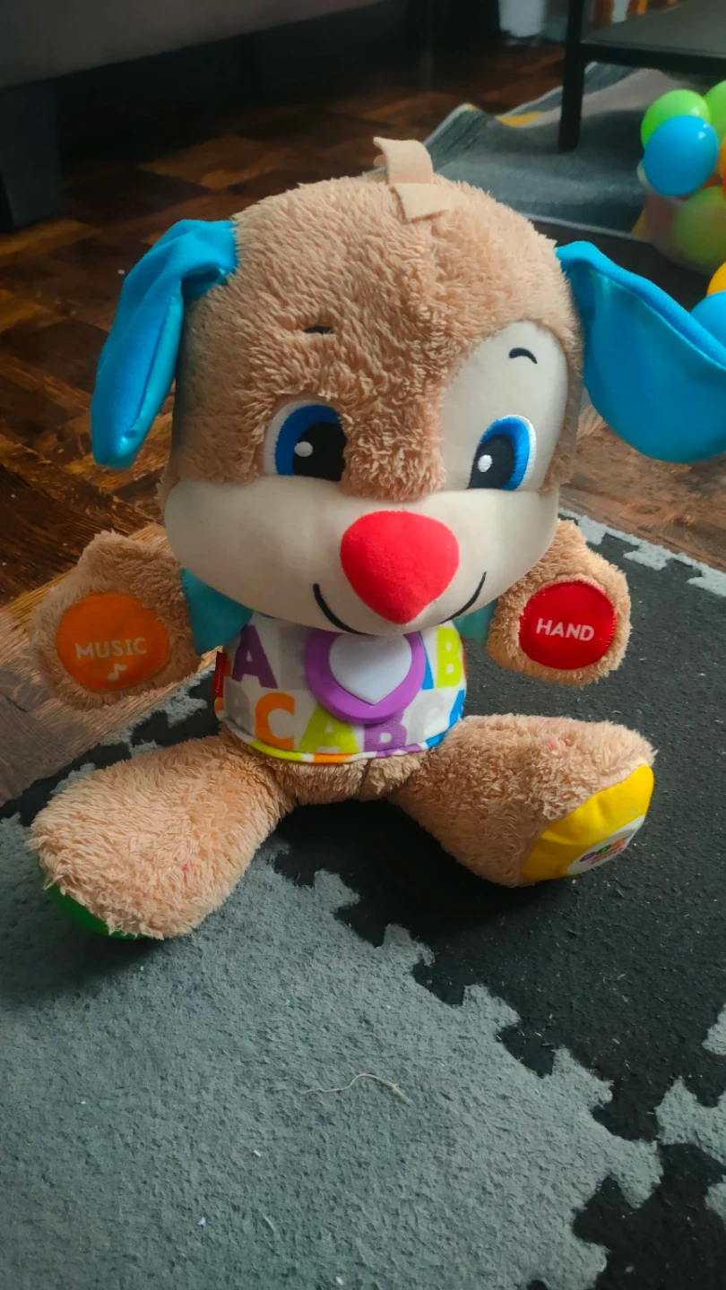 This Fisher-Price Laugh & Learn Smart Stages Puppy is a soft, plush toy designed for learning. It has buttons on its paws that play music and teach about hands. The puppy's tummy features colorful letters spelling out "ABC". It's a great companion for little ones starting to learn.