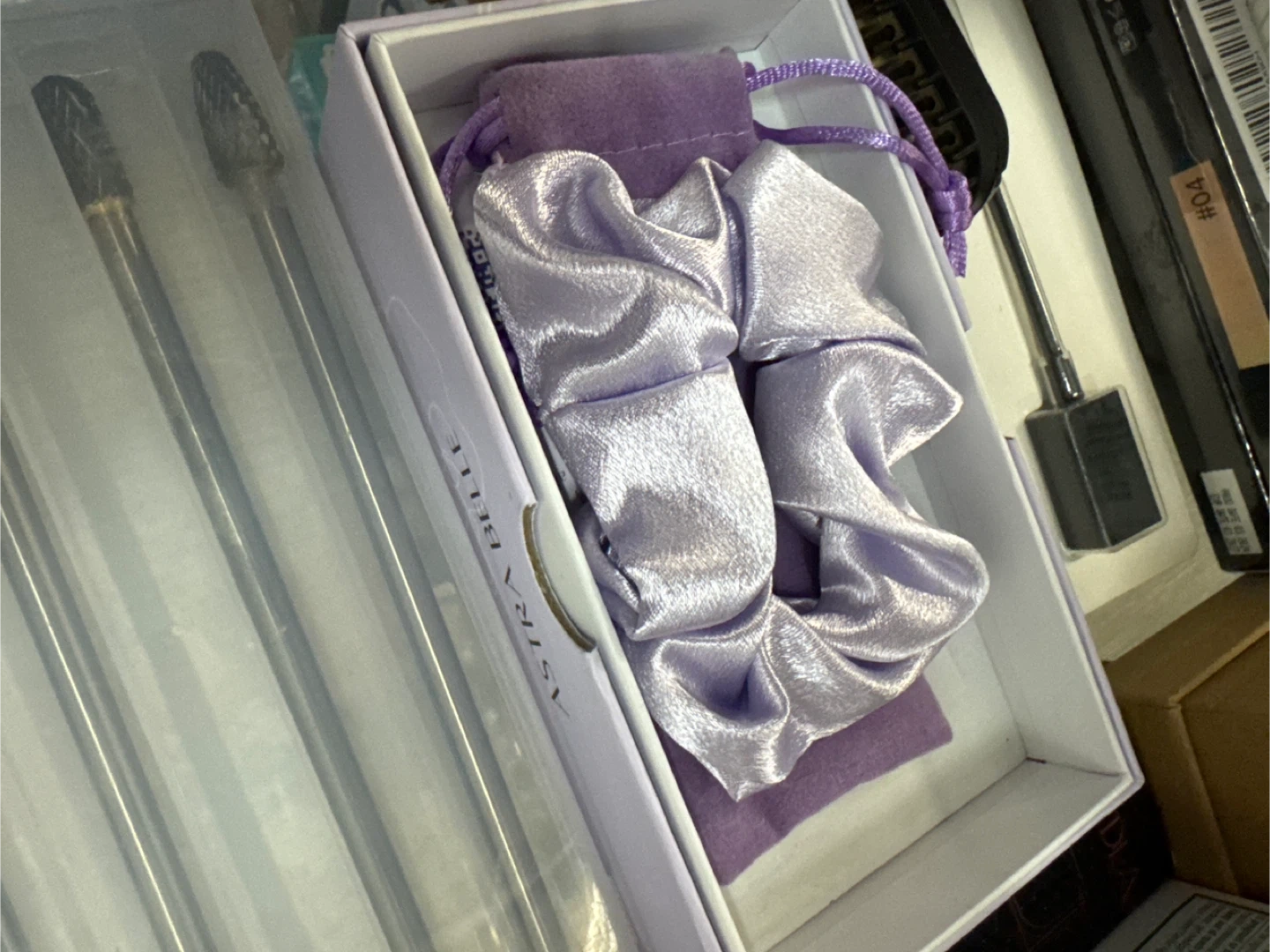 Selling a brand new set of Astra Belle scrunchies! They come in a lovely box, perfect for gifting or treating yourself. The scrunchies are a beautiful light purple colour and appear to be satin or silk. Comes with a small purple pouch as well!
