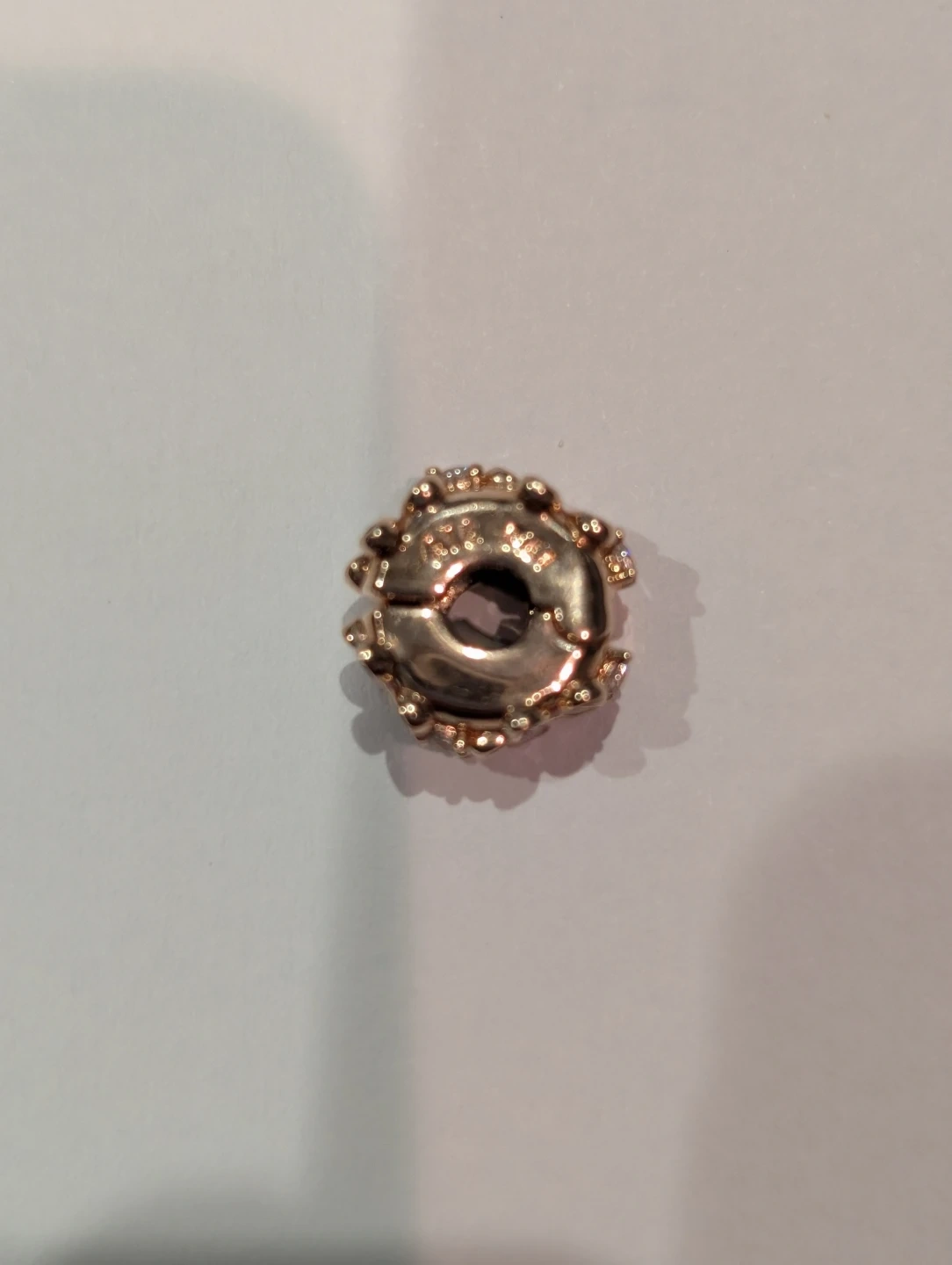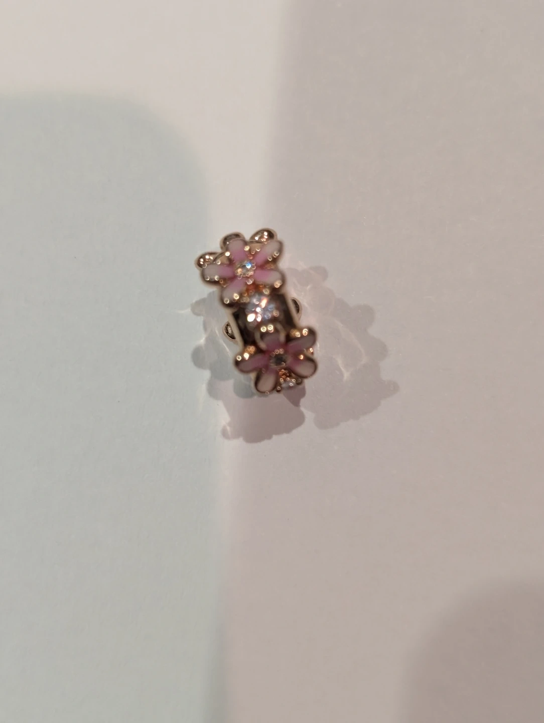 This Pandora Pink Daisy spacer clip charm features a delicate pink flower design with clear accent stones. It's made of sterling silver and 14 K rose gold plated designed to fit Pandora bracelets. Add a touch of floral beauty to your collection!