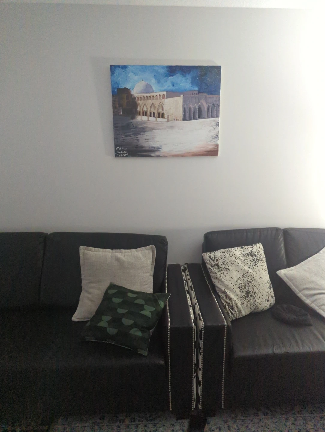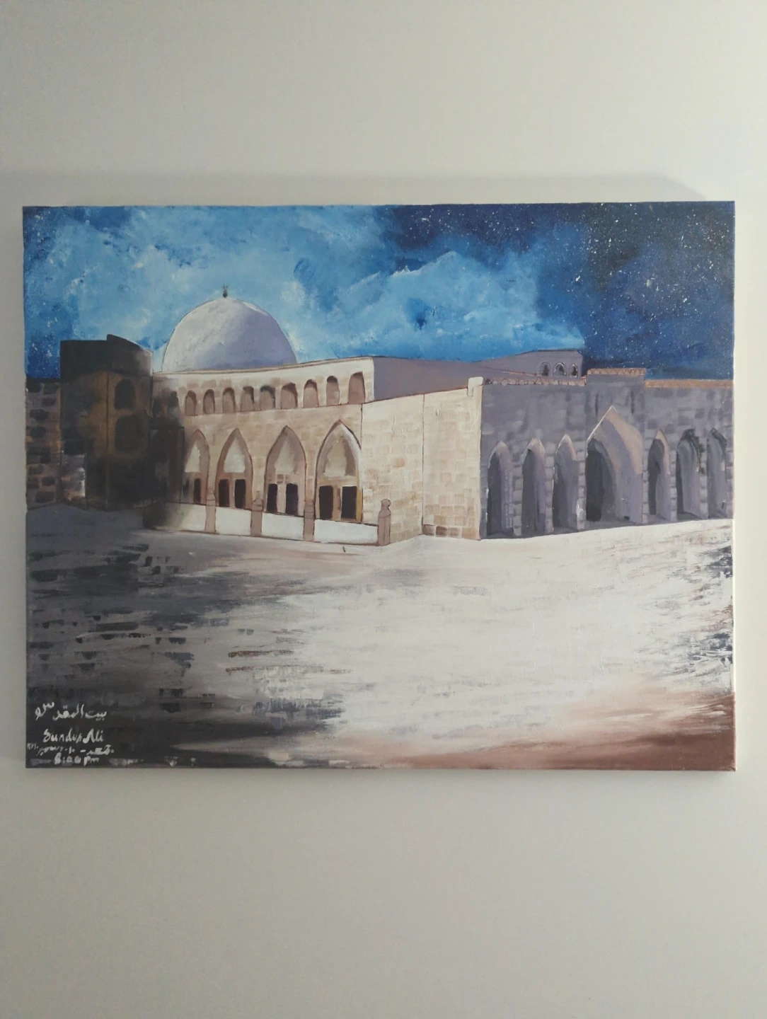 Acrylic painting depicting a mosque with a dome and arches under a starry night sky. The artwork showcases a blend of architectural detail and abstract background elements.