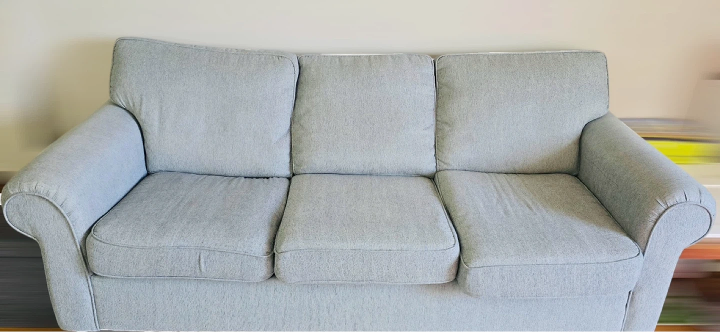This is a comfortable 3-seater sofa in a light blue fabric. Its neutral colour and classic design make it a versatile addition to any living space. It features three plush seat cushions and three back cushions.