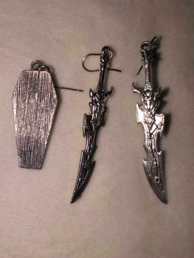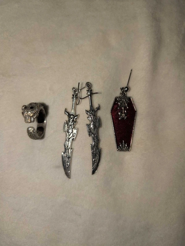 This used jewellery set features a unique collection of pieces, including a jaguar ring, sword earrings, and a coffin pendant. The items have some wear, which is reflected in the lower price, but they remain striking and distinctive accessories. Comes with a gift box. It's still available if the ad is up!