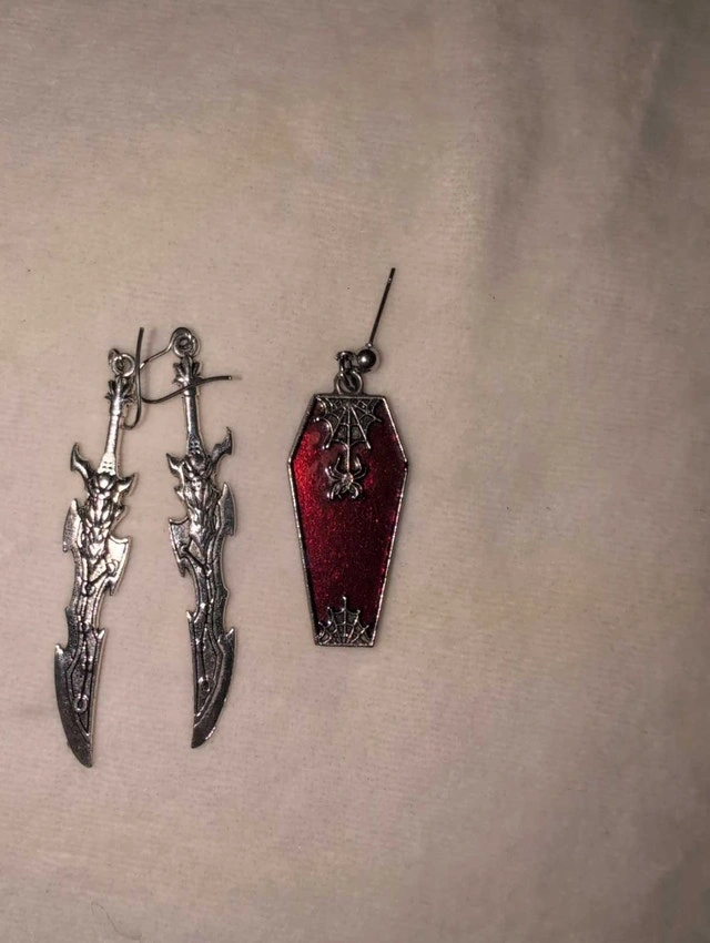 This used jewellery set features a unique collection of pieces, including a jaguar ring, sword earrings, and a coffin pendant. The items have some wear, which is reflected in the lower price, but they remain striking and distinctive accessories. Comes with a gift box. It's still available if the ad is up!
