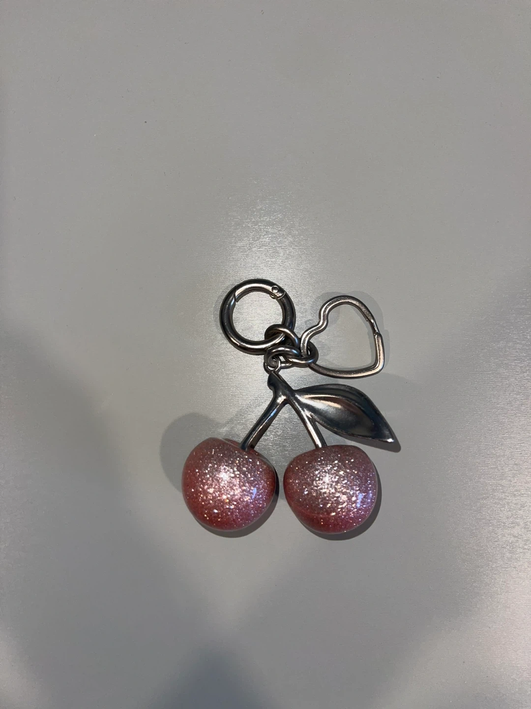 Super cute pink glitter cherry keychain with a leaf detail and a heart-shaped charm. It's a fun accessory for your purse or keys!