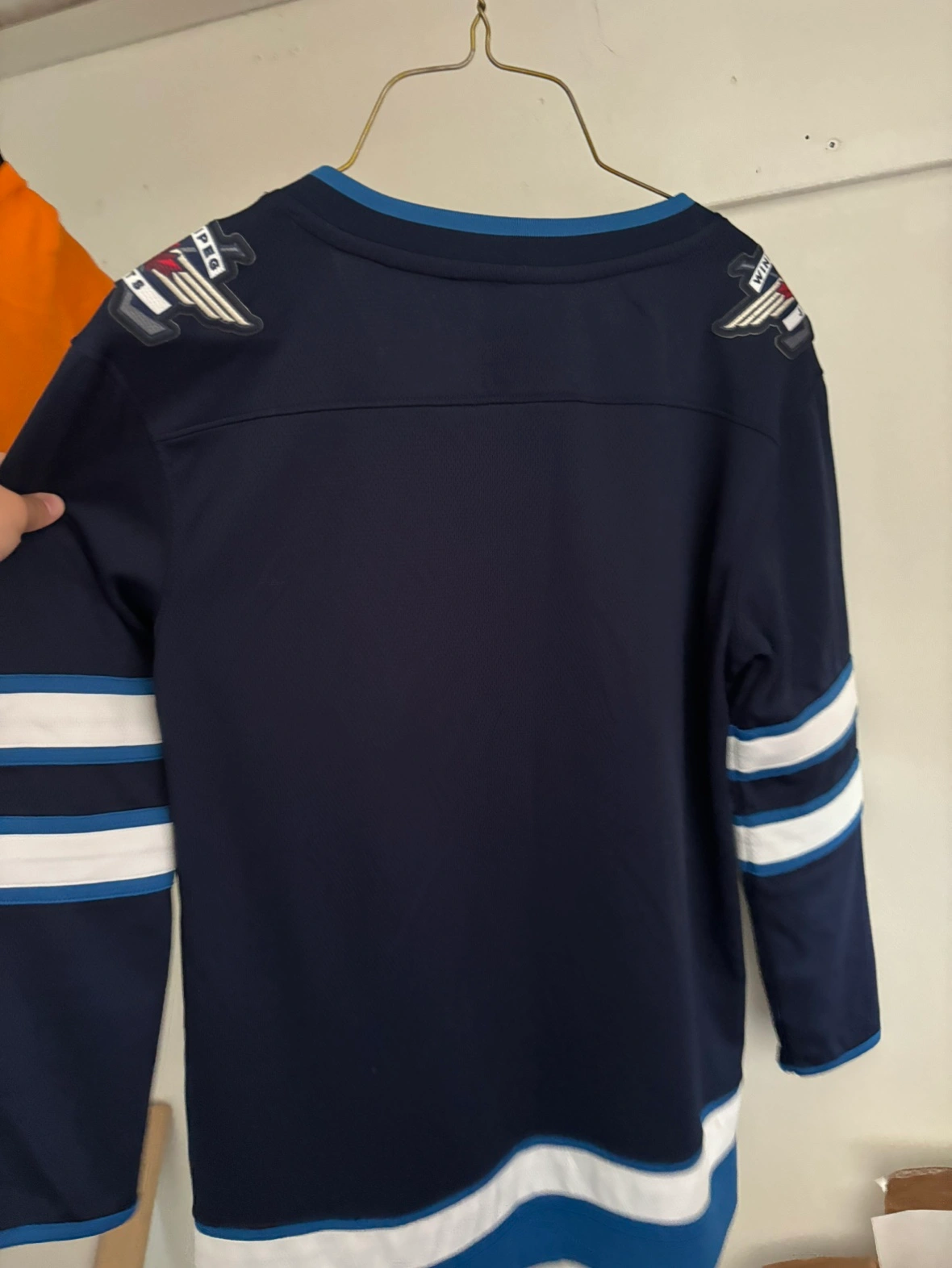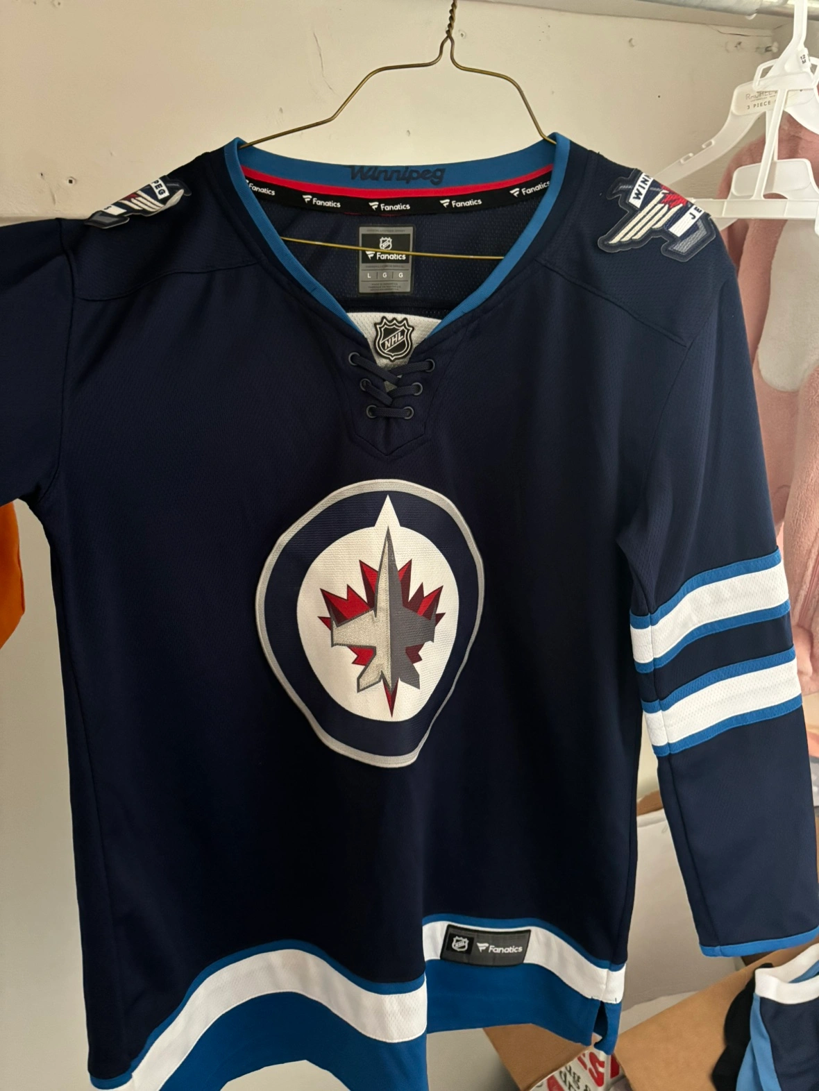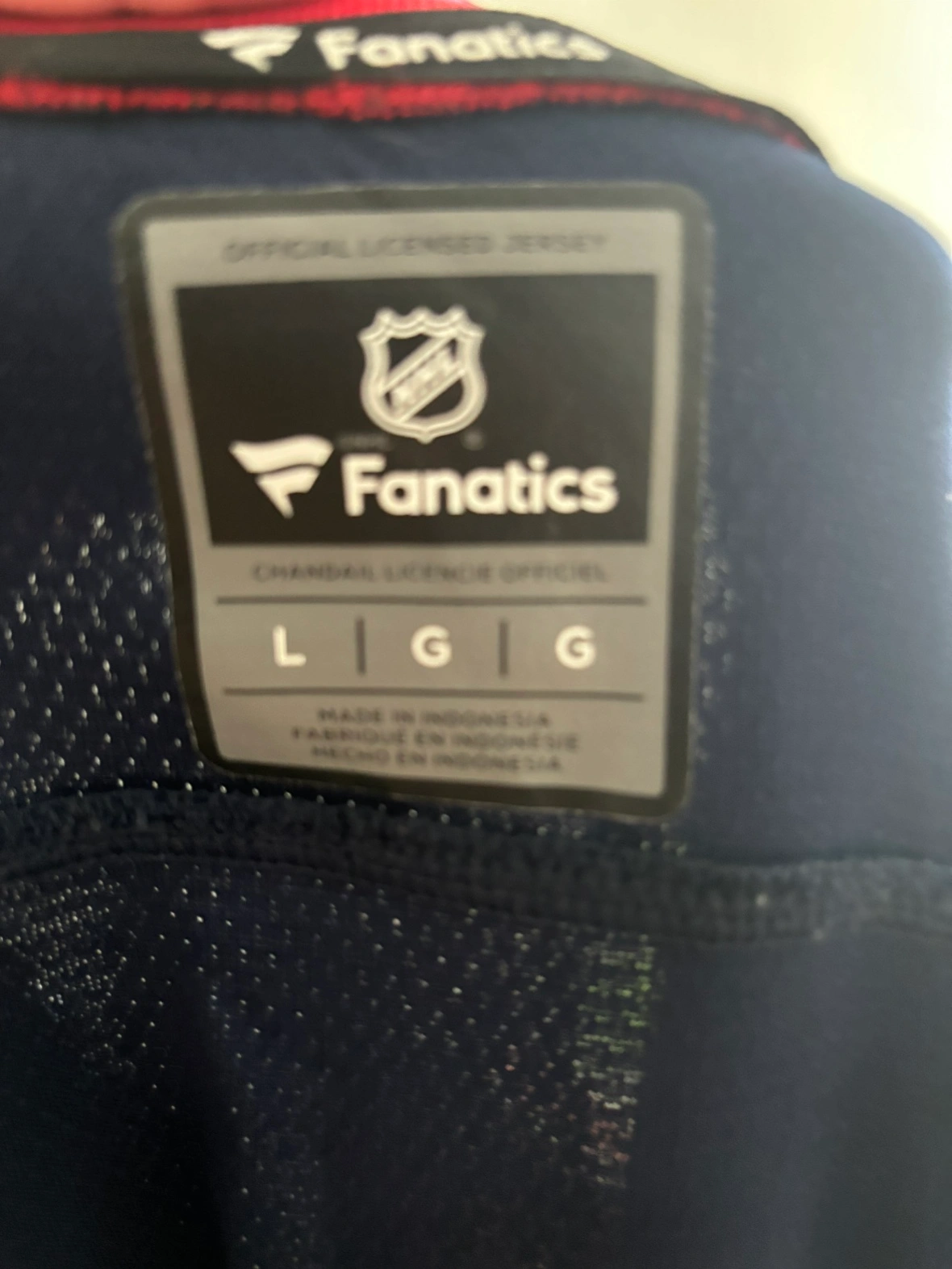 Fanatics brand jersey, size large. The jersey is navy blue with white and blue stripes on the sleeves. It has the Jets logo on the front and the Jets logo on the shoulders. The jersey has a tag indicating it is an official licensed jersey. The jersey is made in Indonesia. OBO