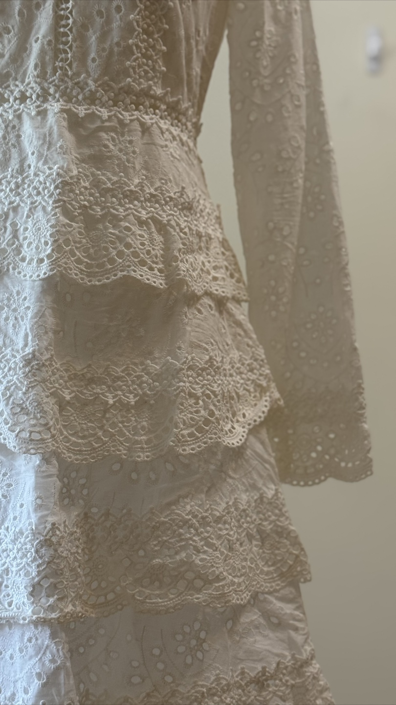 A stunning vintage white lace mini dress with intricate eyelet embroidery and tiered ruffle layers. This romantic piece is perfect for a self-wedding, bridal shower, engagement photos, or special occasions. The feminine silhouette and delicate cotton lace details make it an unforgettable piece for cottagecore, boho, or vintage-inspired styling.