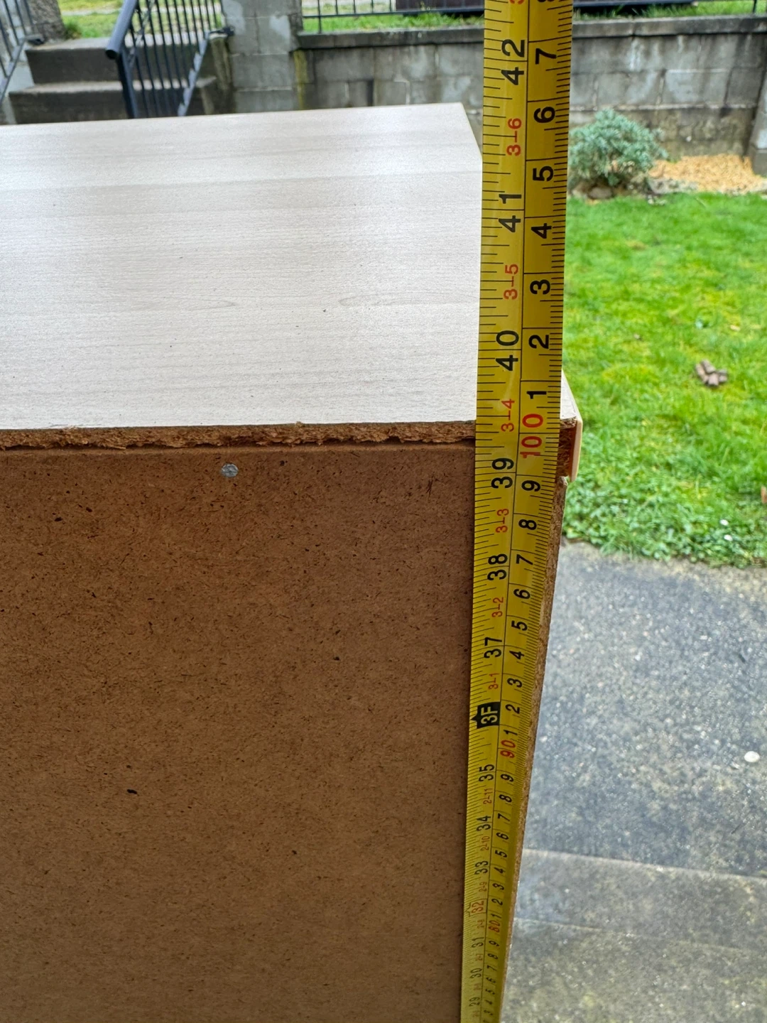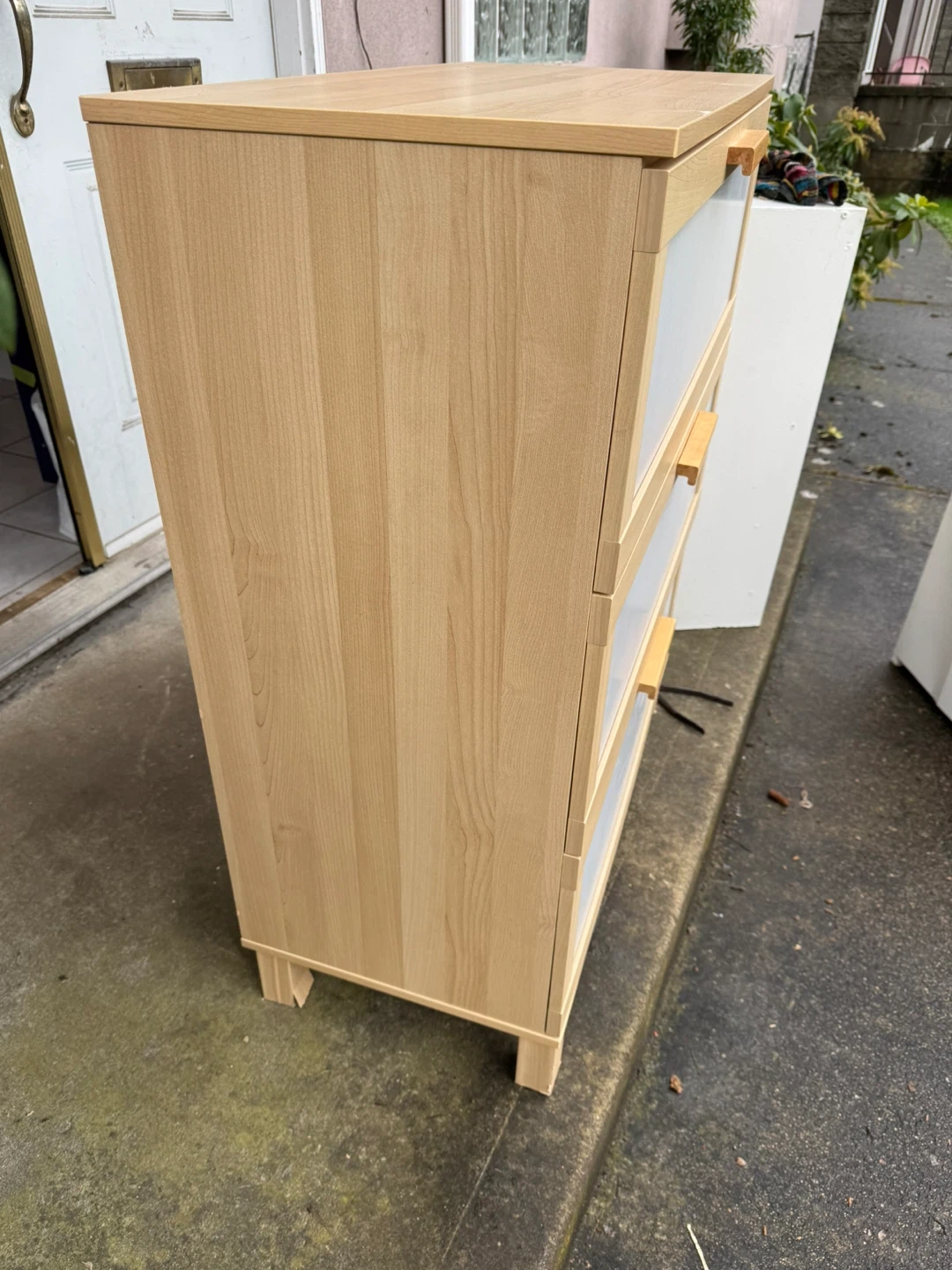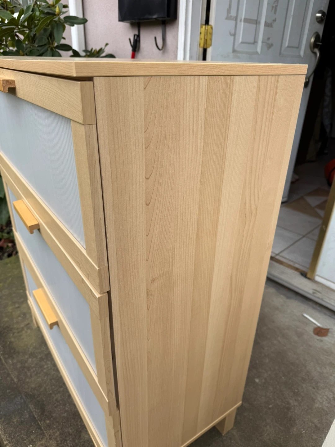 Light wood cabinet with three drawers. The fronts of the drawers have a ribbed grey texture and wooden handles. It's a great piece for storage in any room! 2nd and bottom Drawers get stuck sometimes