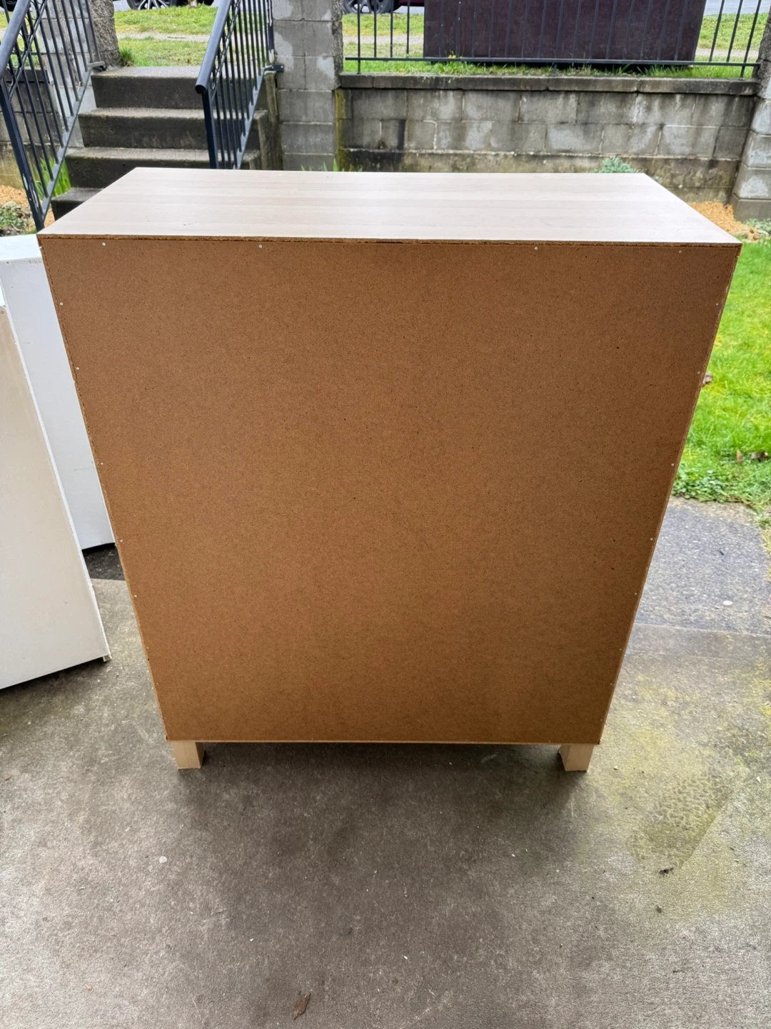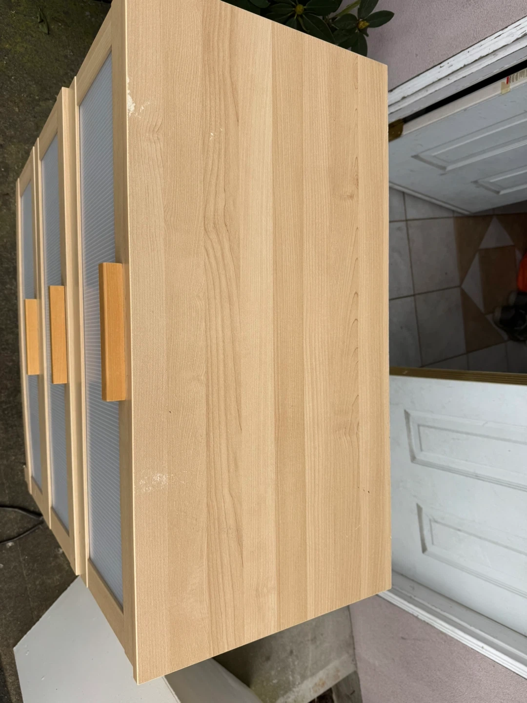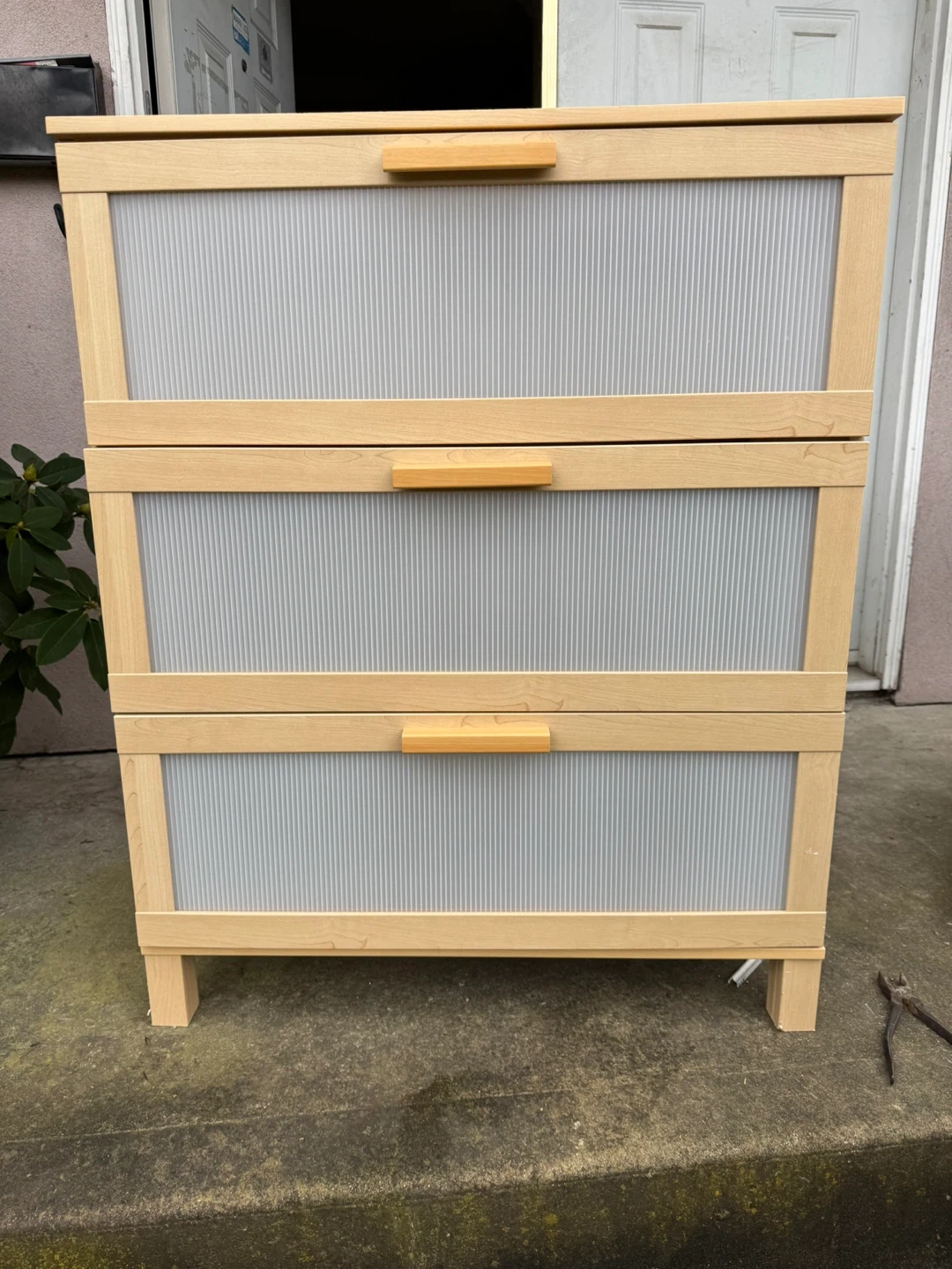 Light wood cabinet with three drawers. The fronts of the drawers have a ribbed grey texture and wooden handles. It's a great piece for storage in any room! 2nd and bottom Drawers get stuck sometimes