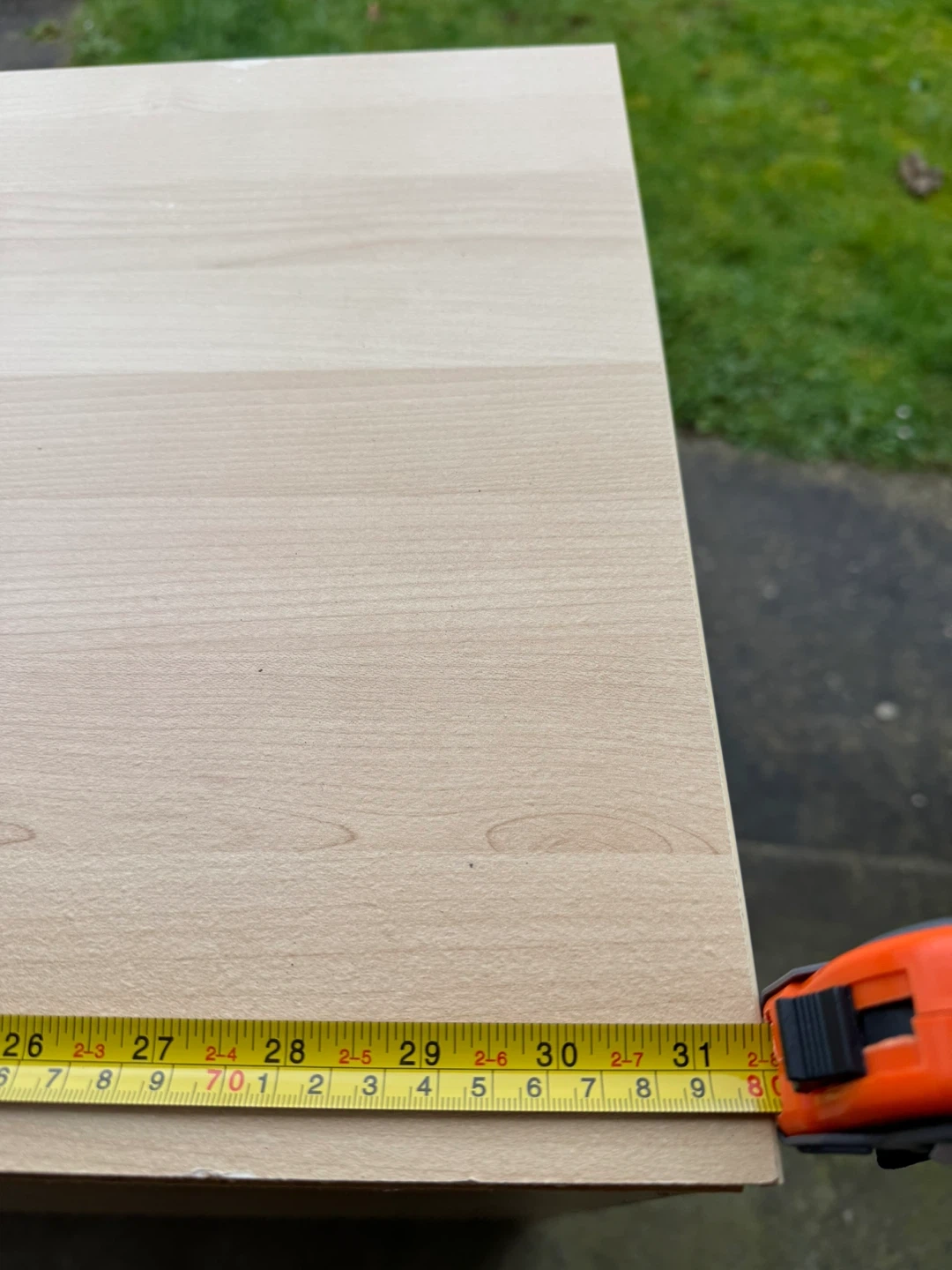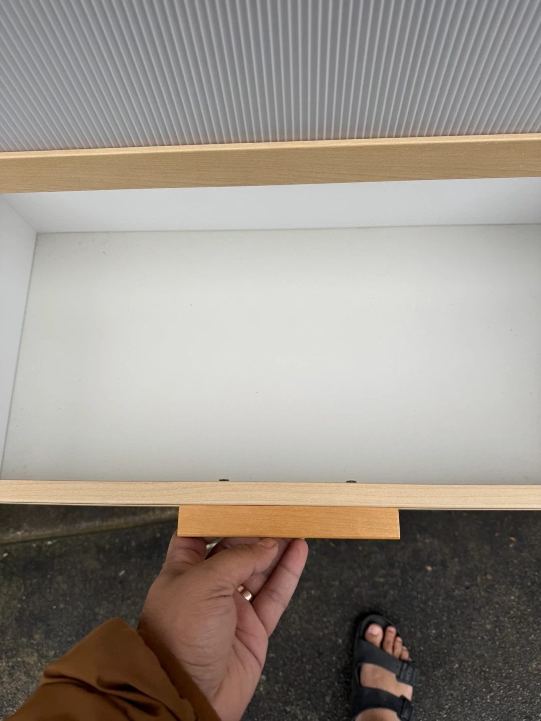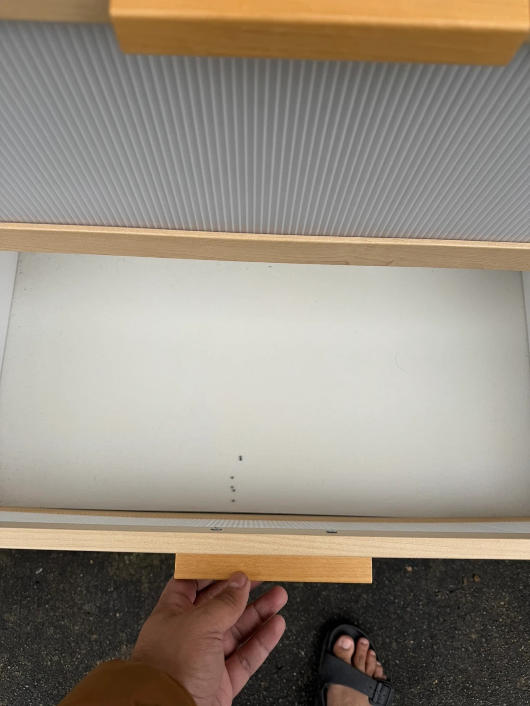 Light wood cabinet with three drawers. The fronts of the drawers have a ribbed grey texture and wooden handles. It's a great piece for storage in any room! 2nd and bottom Drawers get stuck sometimes