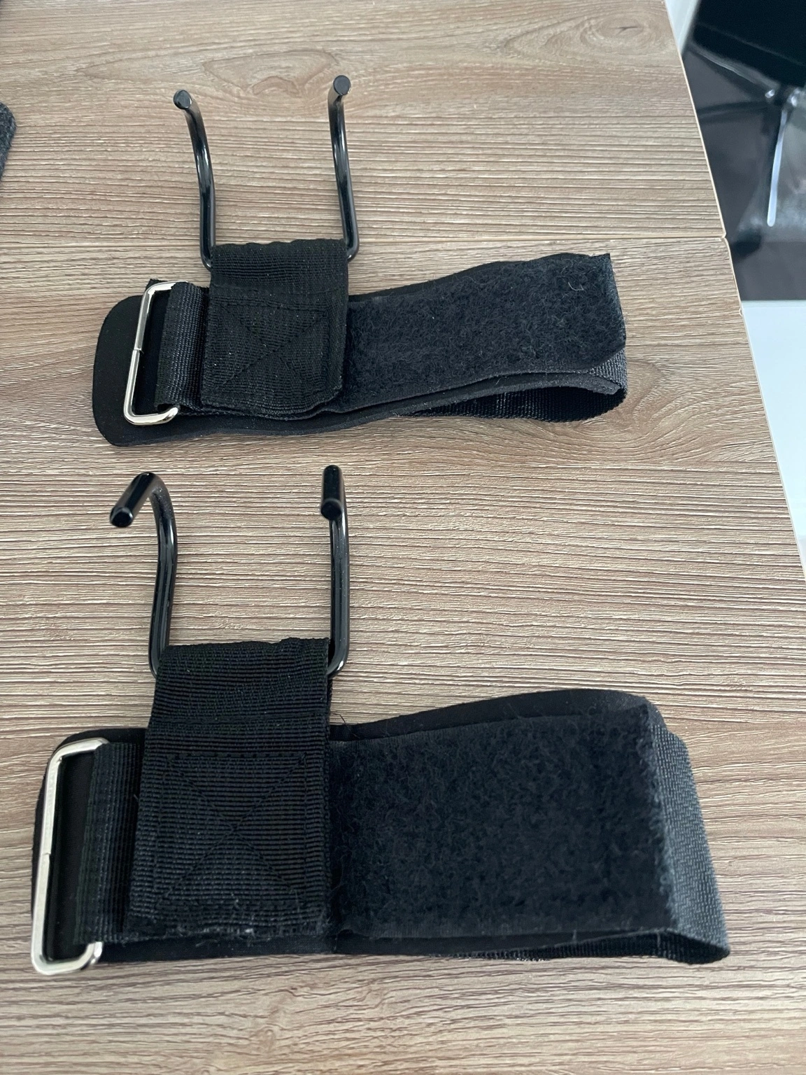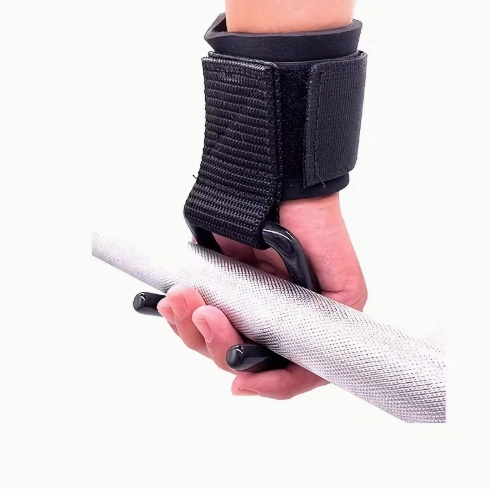 Pair of gym lifting hooks with adjustable wrist straps. Helps improve grip for weightlifting, deadlifts, rows and pull exercises.