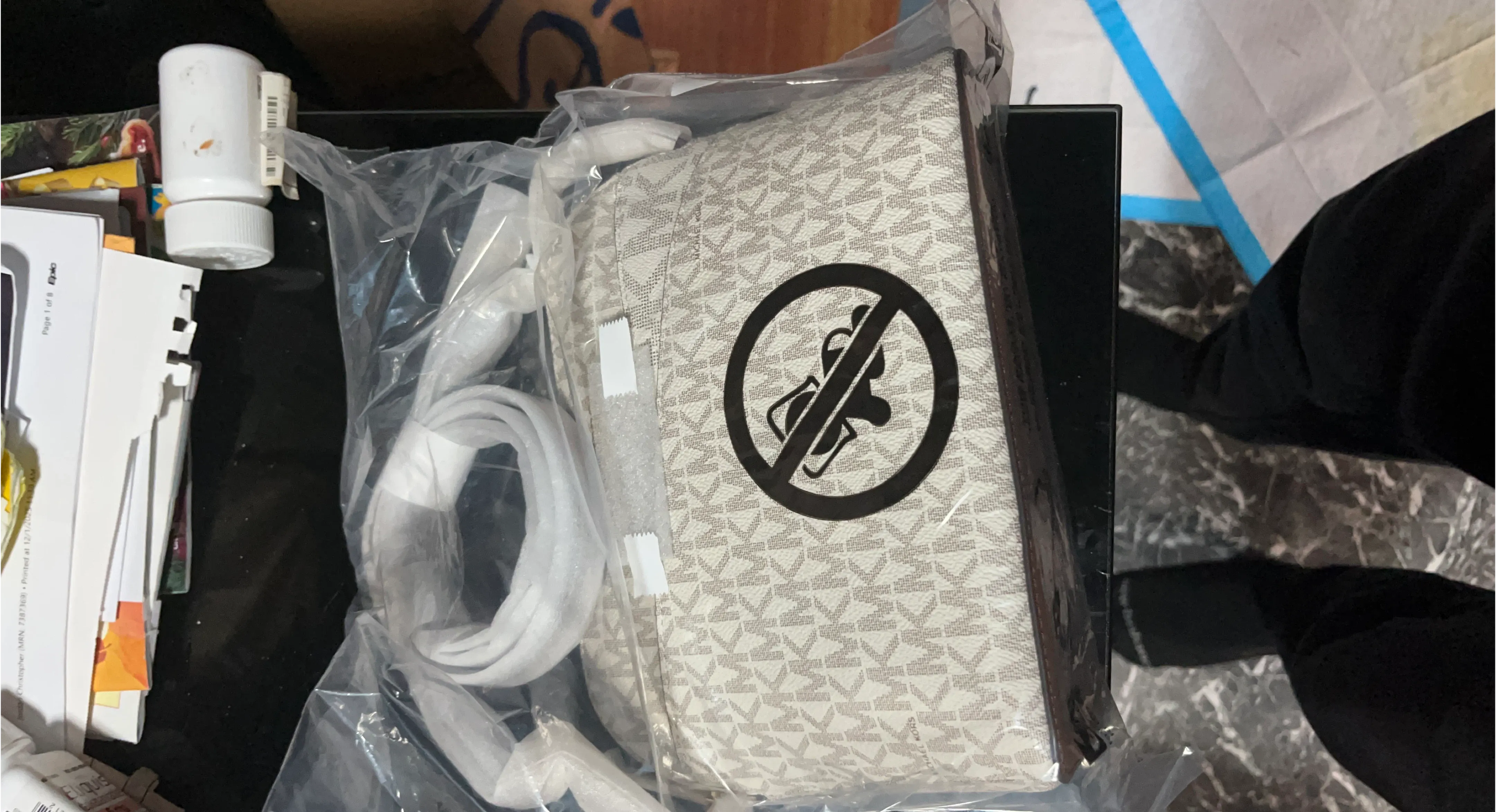 This is a new Michael Kors Jet Set Travel camera bag. It features the signature MK logo pattern in vanilla and acorn. The bag comes with a long adjustable strap.