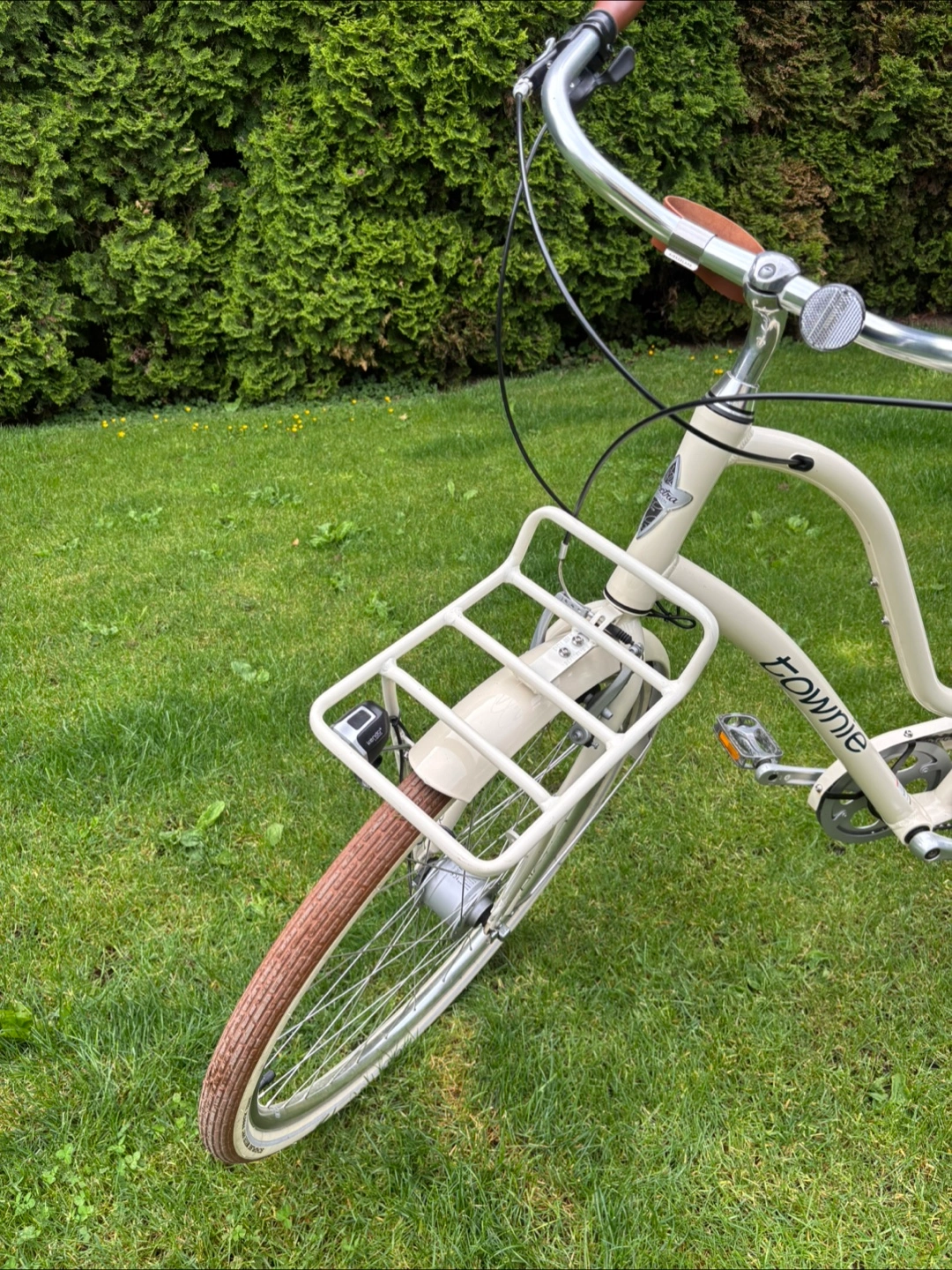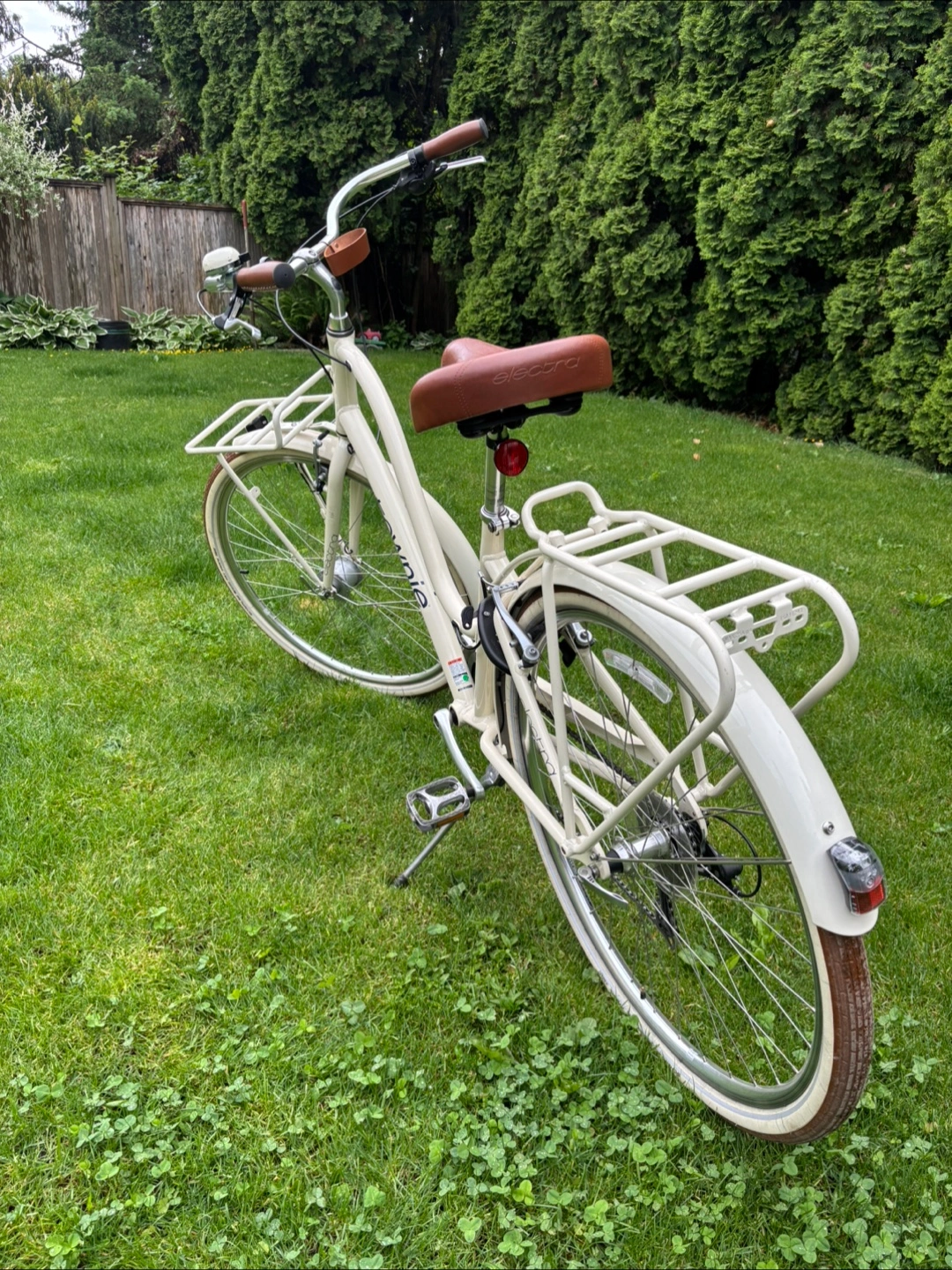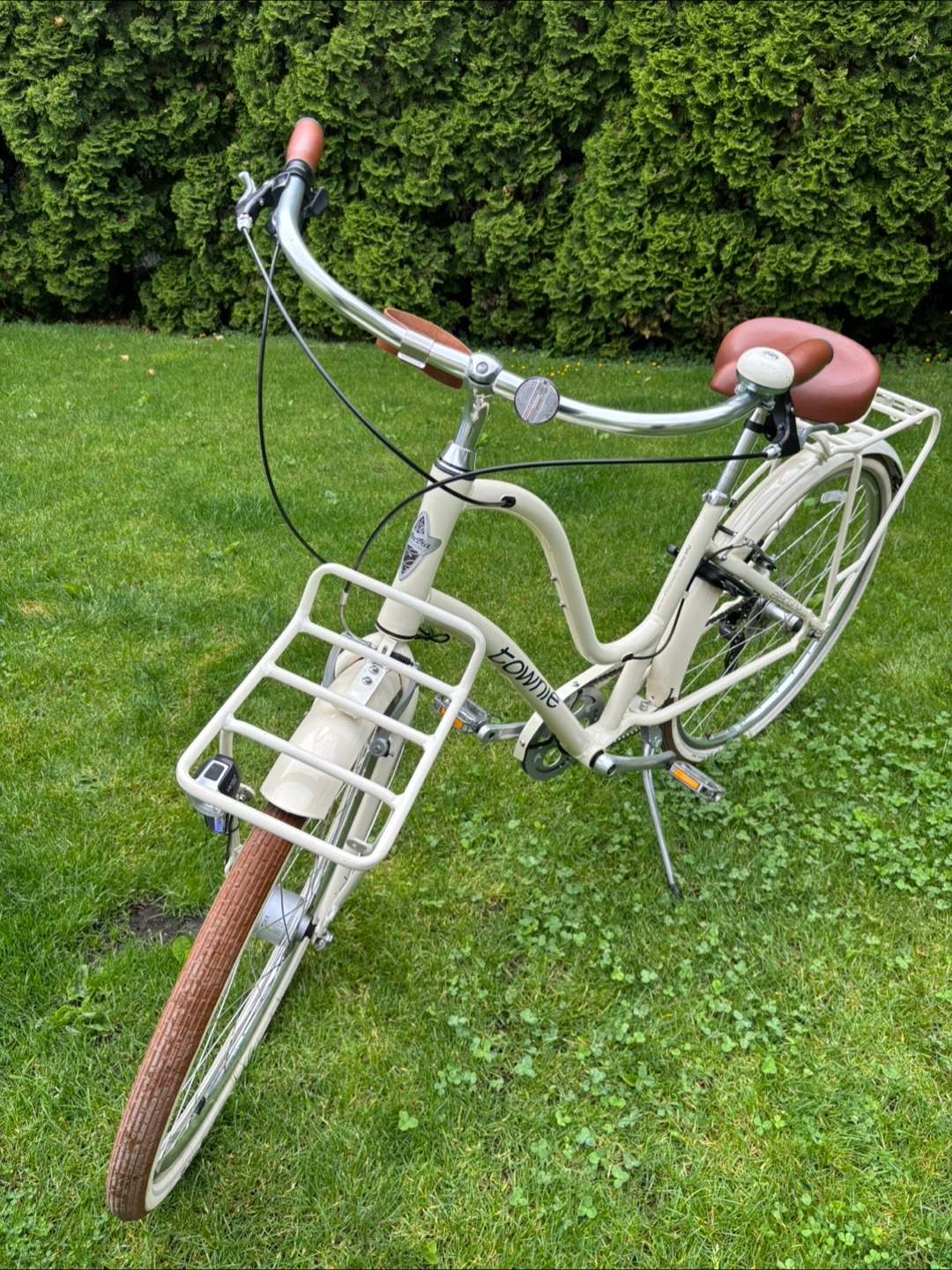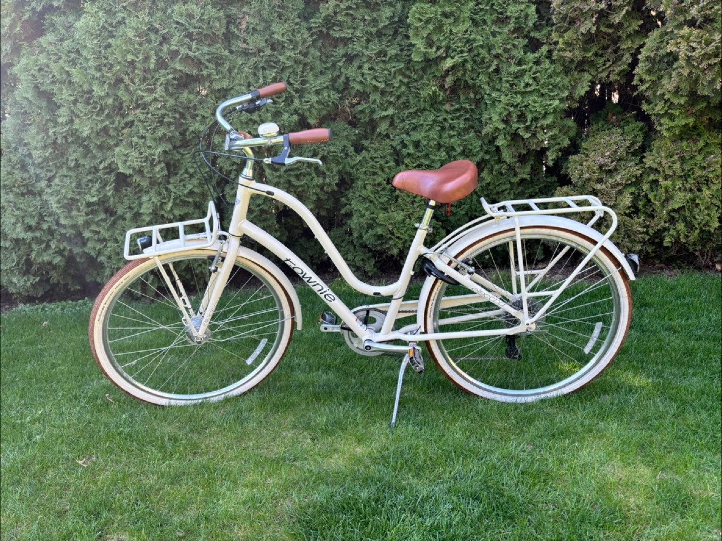 Cream coloured 8 gear cruiser bicycle. Features include front and rear racks, brown leather-like grips and saddle. Equipped with Shimano gears and hand brakes. Great condition