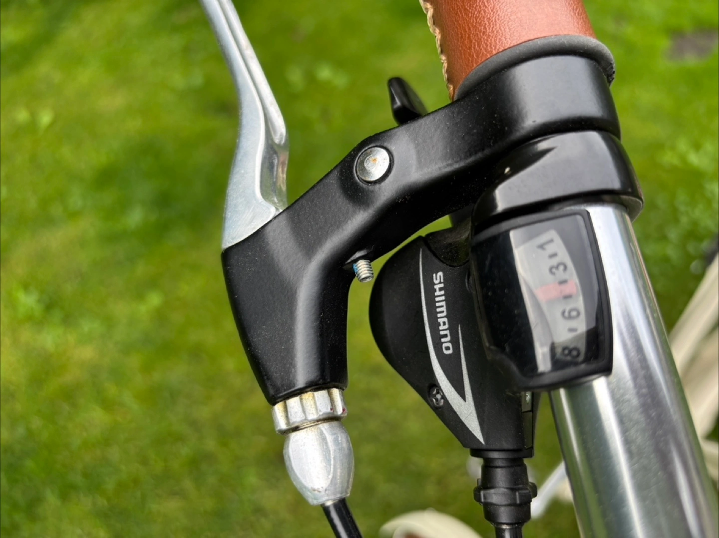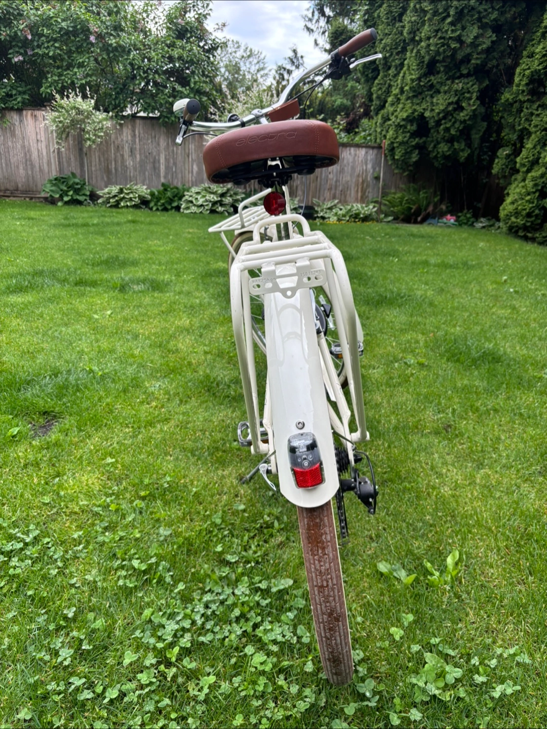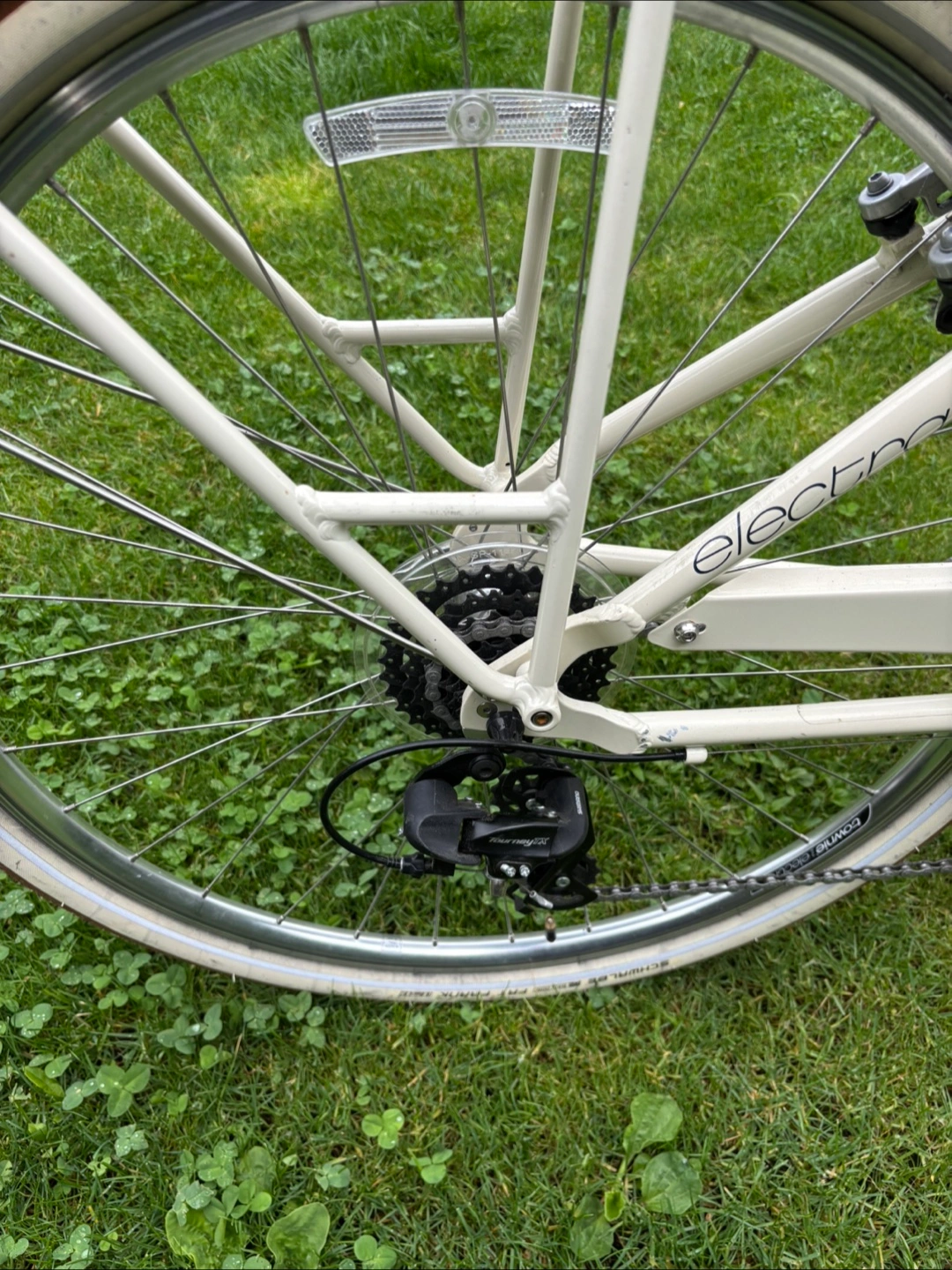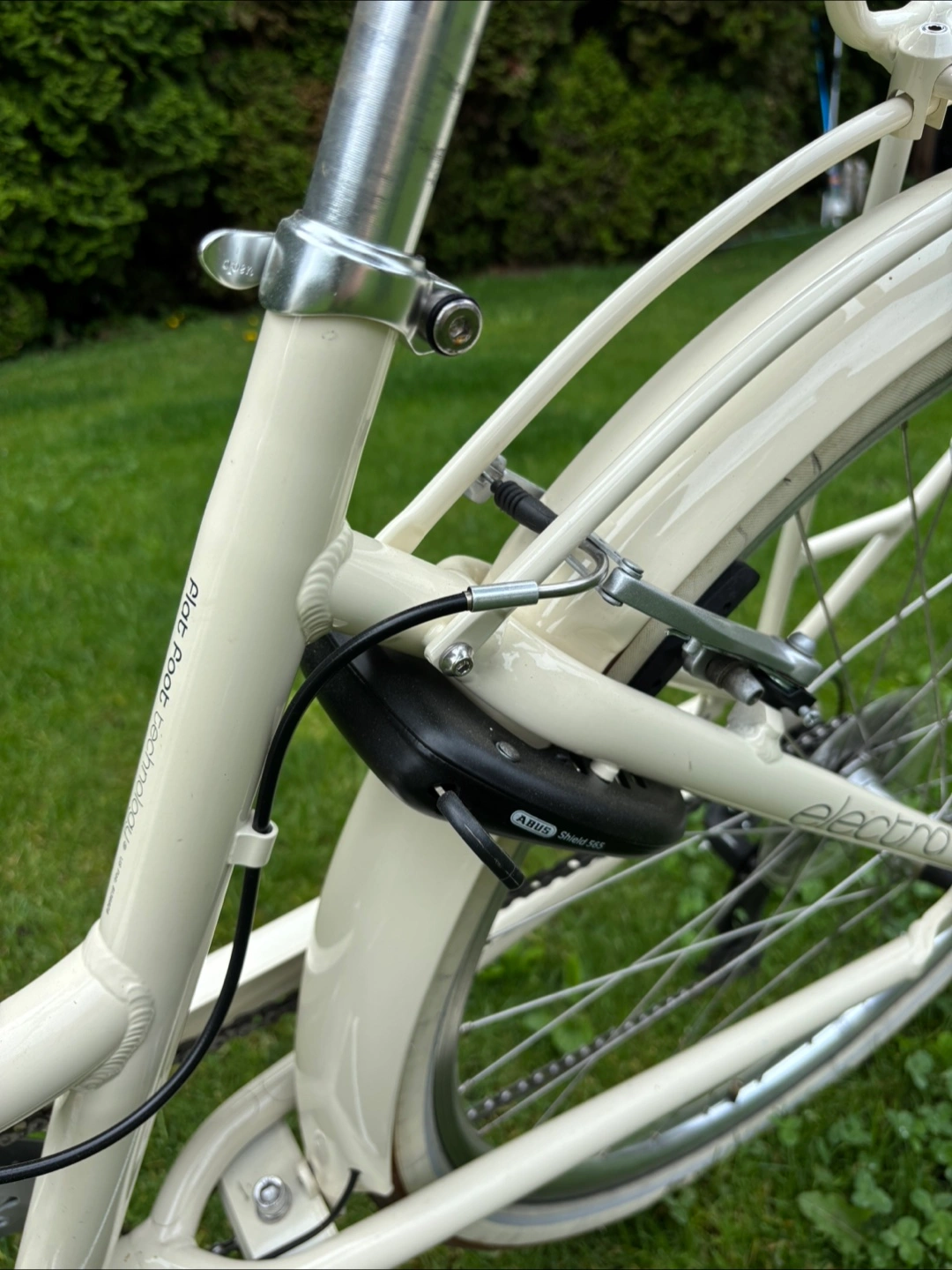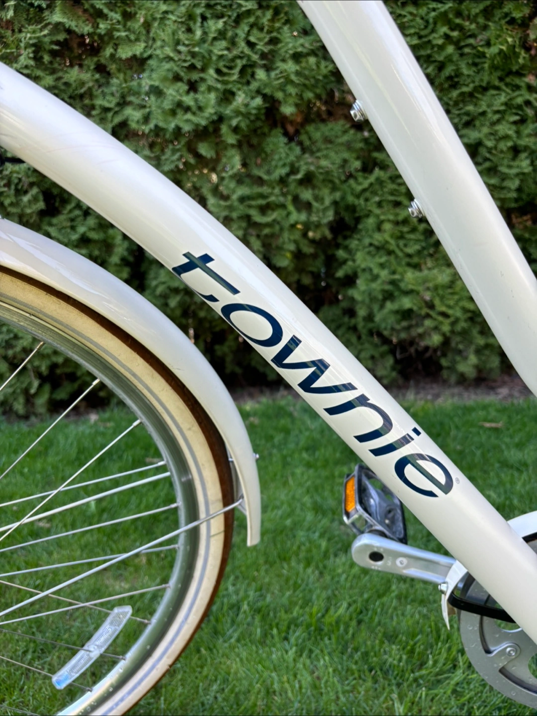 Cream coloured 8 gear cruiser bicycle. Features include front and rear racks, brown leather-like grips and saddle. Equipped with Shimano gears and hand brakes. Great condition