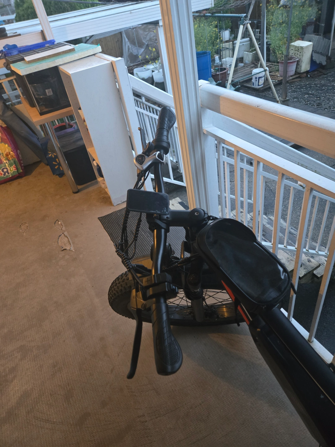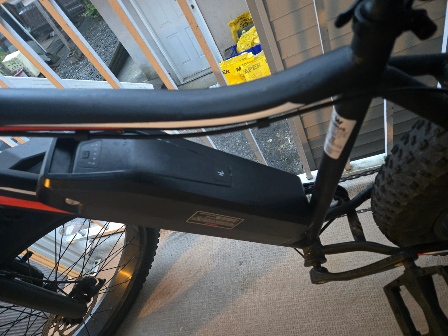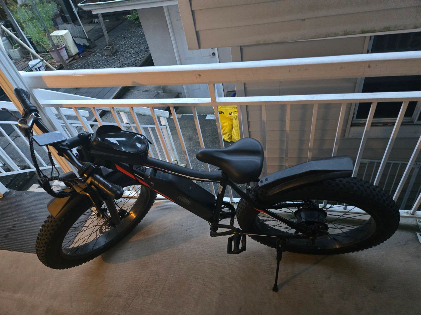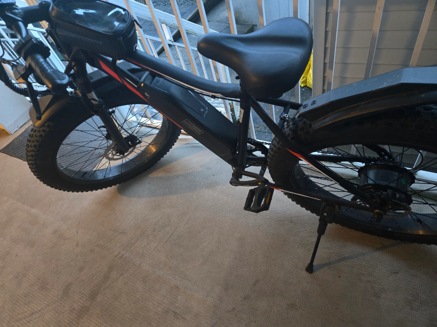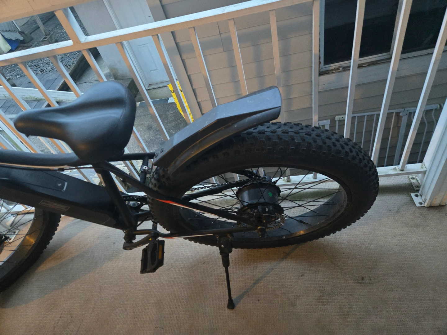 Black electric fat tire bicycle. Features a black frame with red accents. Includes a kickstand, fenders, and a battery pack. Good condition. open to offers only in cash Thanks