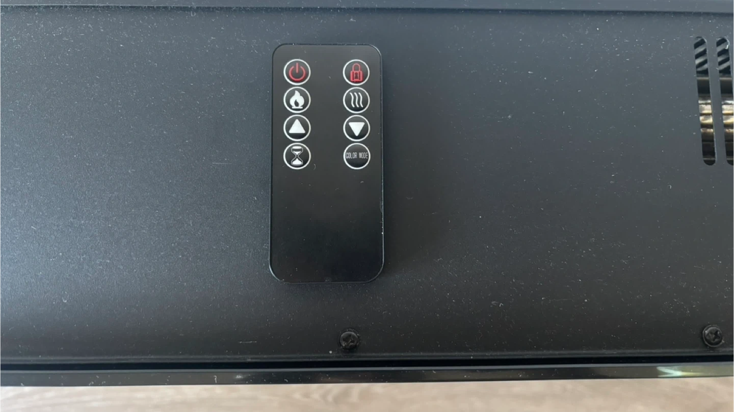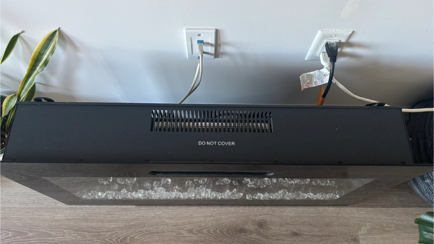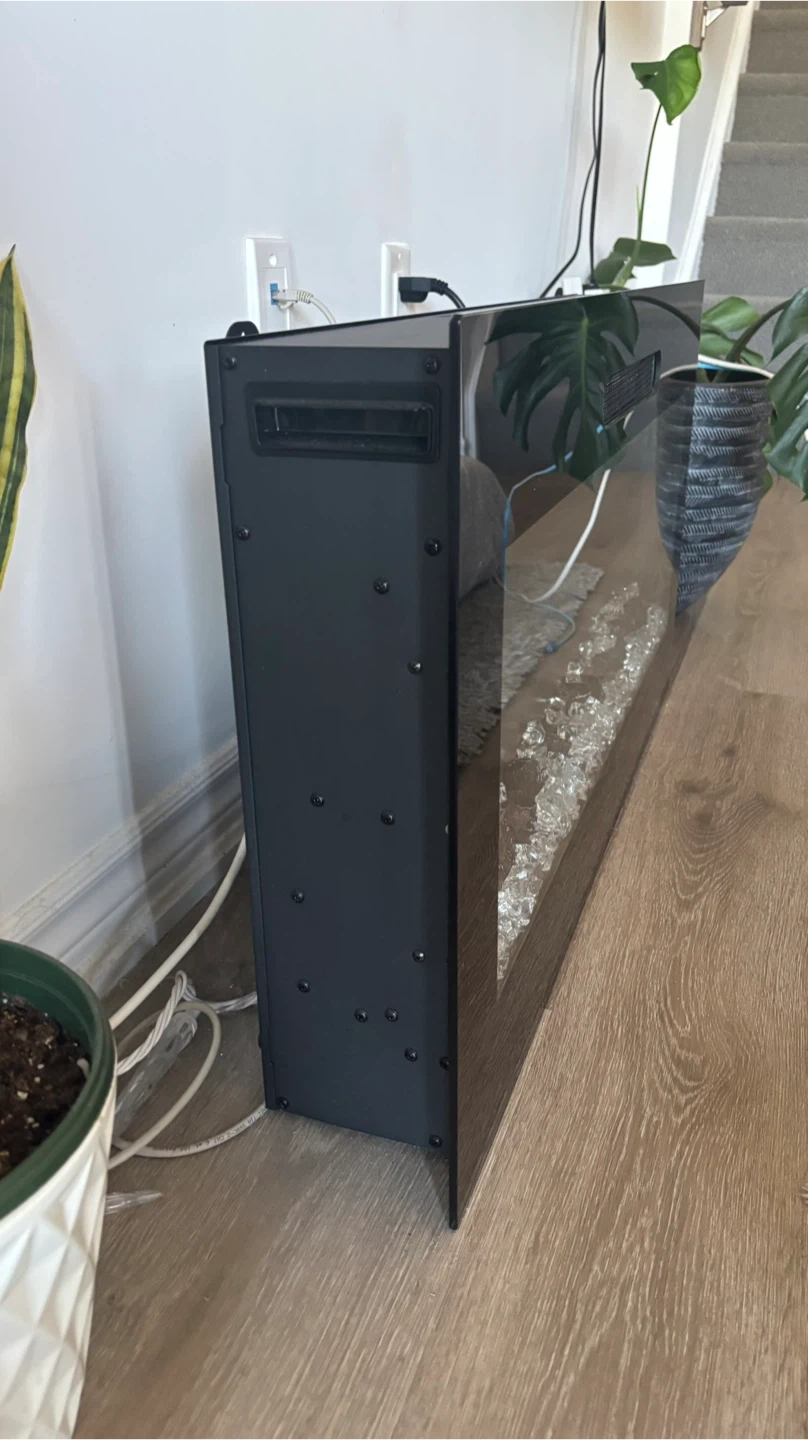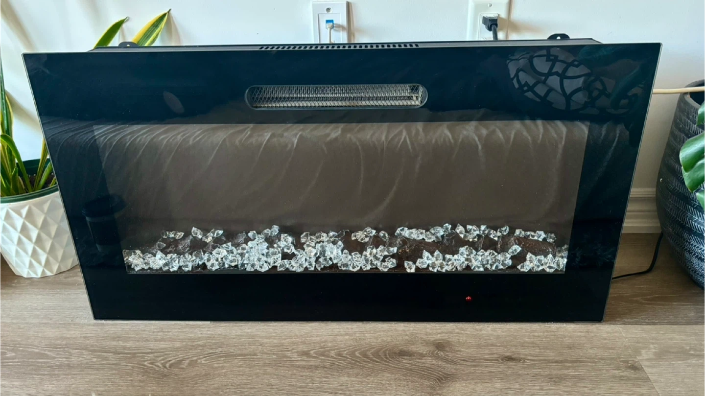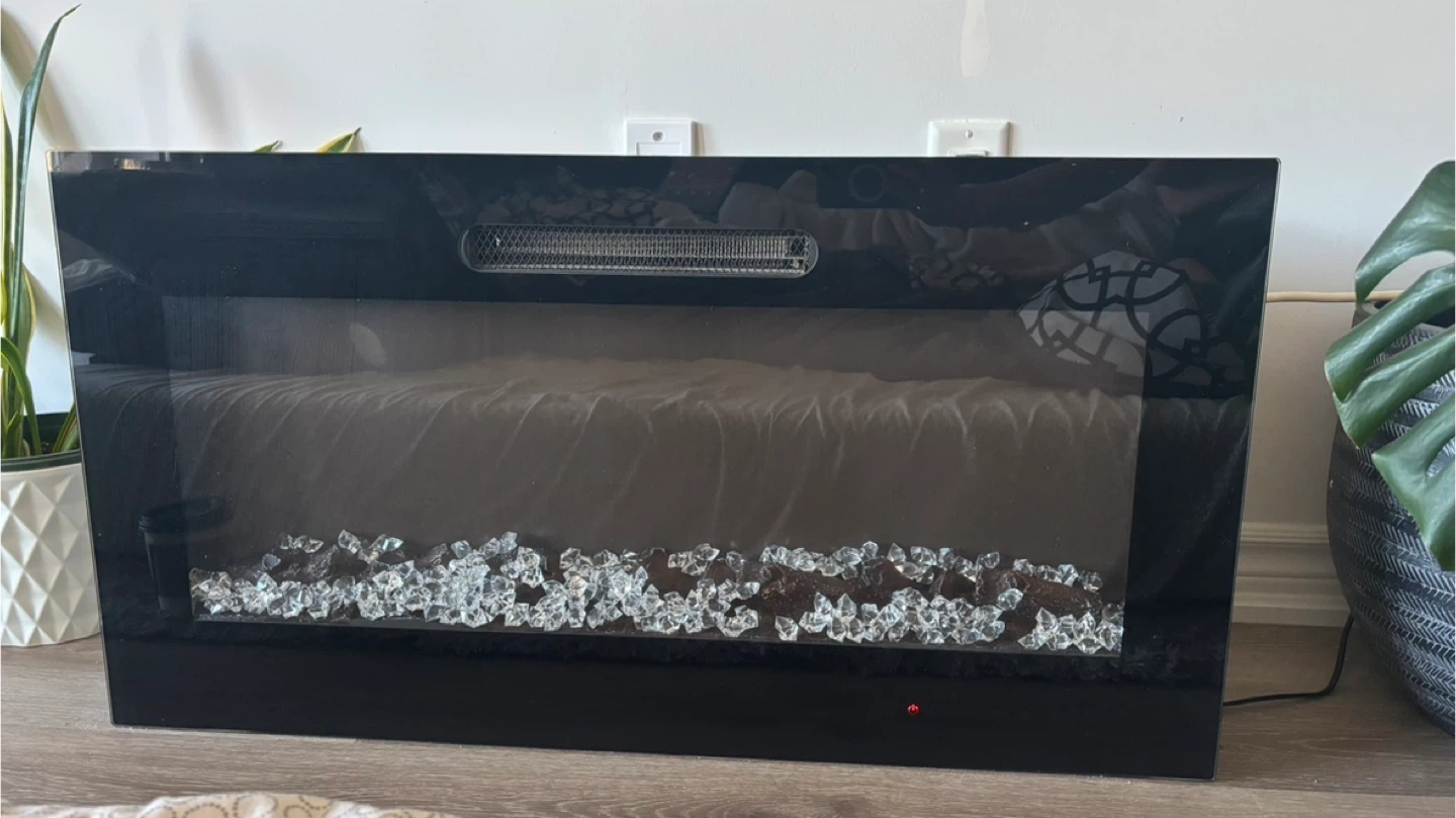 Selling an electric heating fireplace! It features a sleek black design and a bed of crystals for a modern look. Comes with a remote control for easy adjustments