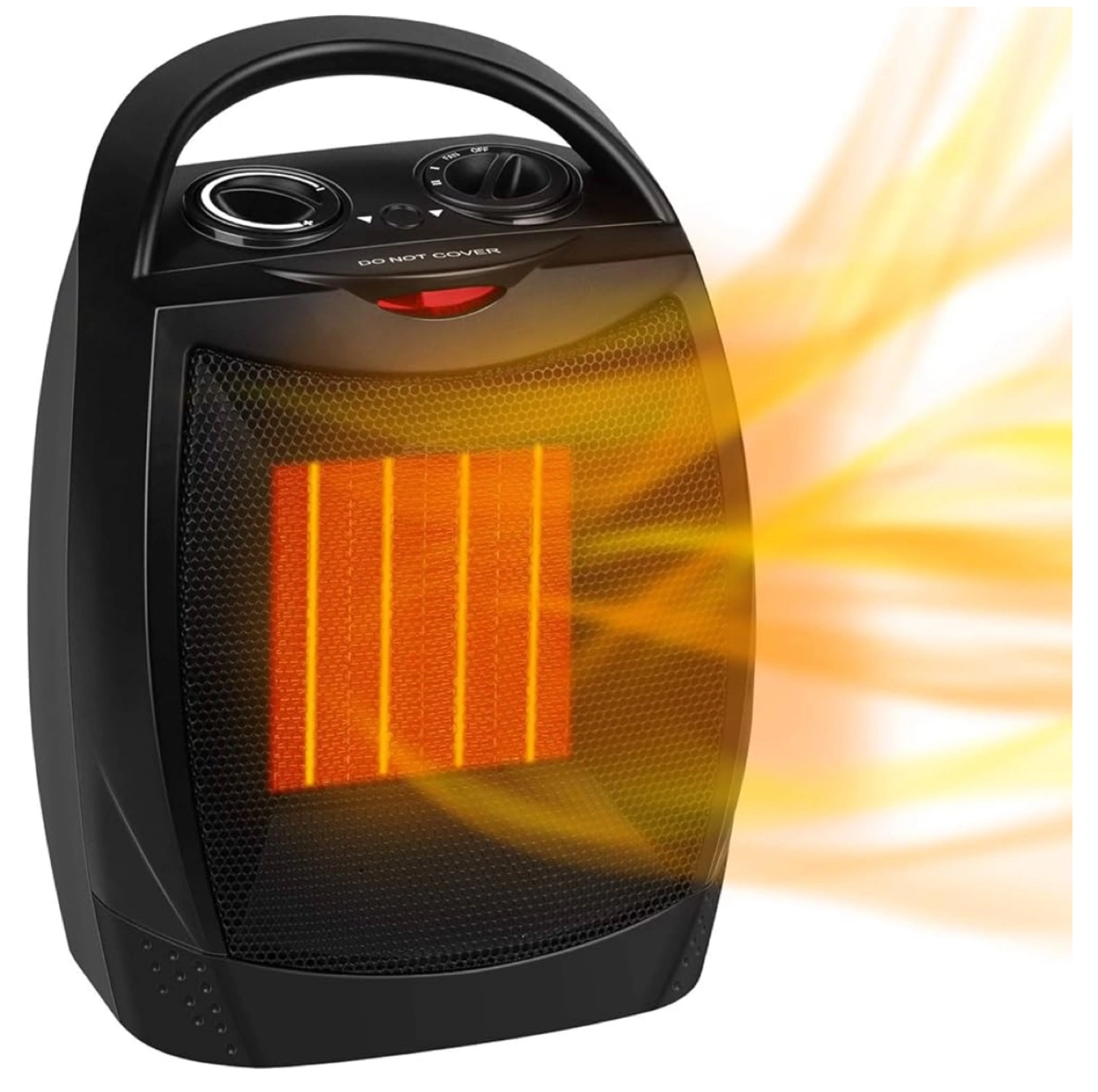 Black electric heater with a handle. Has two heat settings and an off setting.