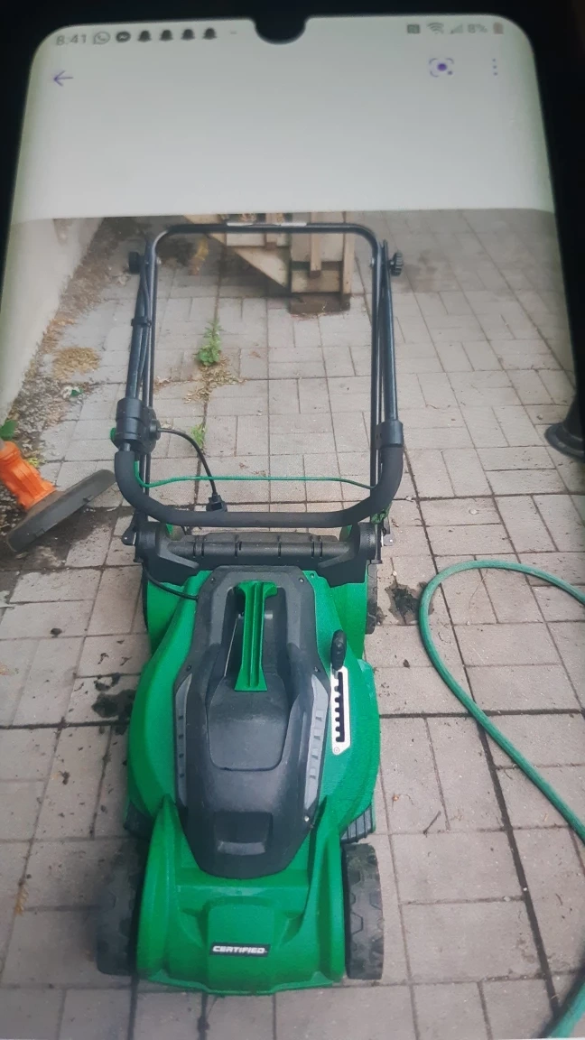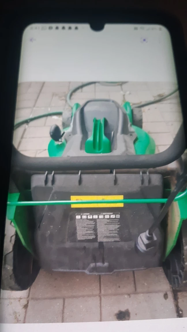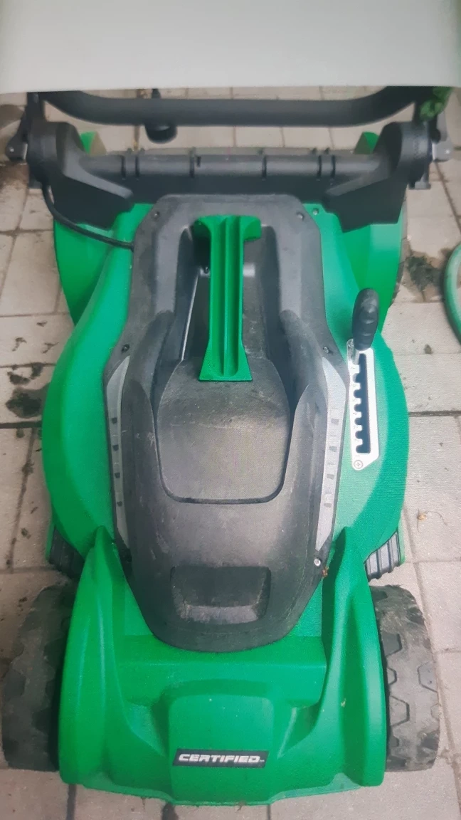 Selling a Certified electric lawn mower. It's green and in used condition.