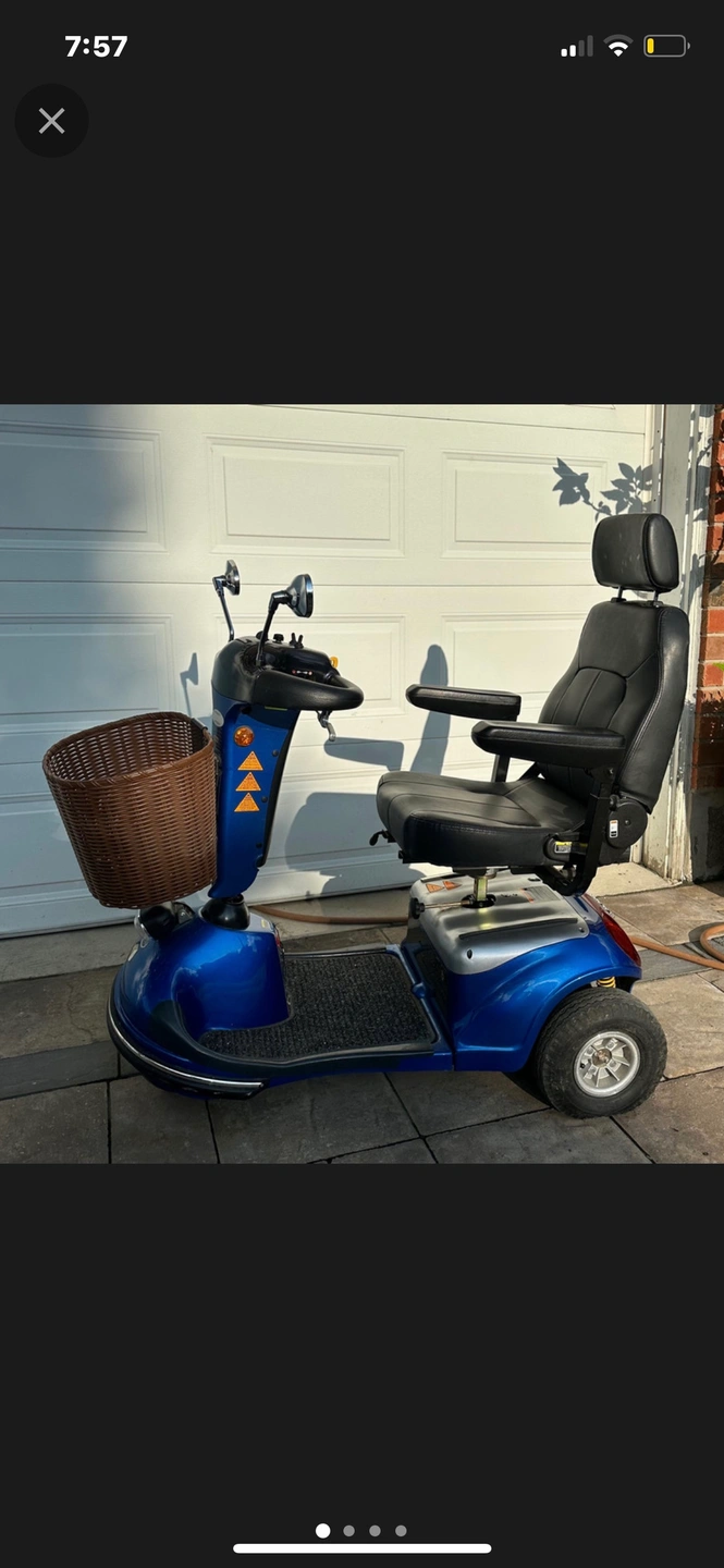 Blue mobility scooter with basket. Has lights and a seat with a headrest. It has a turning radius of 45 inches and a top speed of 20km/hr. The scooter is in good condition and runs well. I also have another blue one close a little bit faster about 32 km. It is the one with the basket in the back. It has an alarm key fob alarm system and brand new batteries just purchased in July, they were my mom, Scooter’s, both Scooter’s still in great shape, serious buyers only thank you,