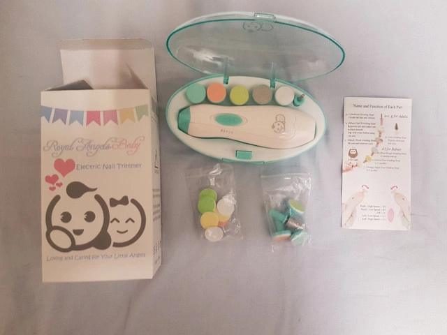 26Royal Angels Baby brand nail trimmer for baby and adult use. Includes travel case, main unit, 3 cushioned grinding heads for baby, 3 filing heads for adult, 3 extra cushioned grinding heads for baby, 8 extra emery pad replacements, and 1 cone grinding head for adult. Never used. Available for pickup near Cambie Road & No. 5 Road in Richmond.