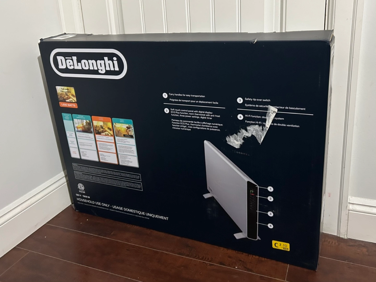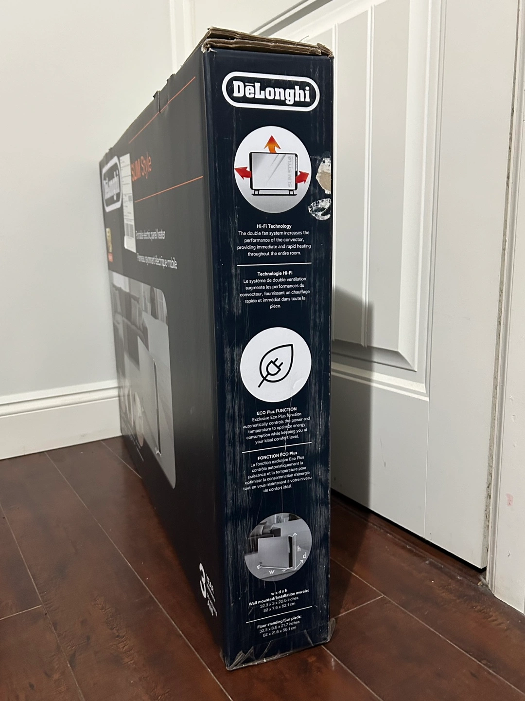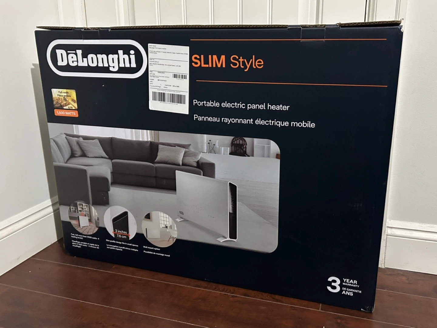 DeLonghi Slim Style 1500 Watt Electric Panel Heater Electric panel heater. Slim design, portable, 1500 watts. Features Hi-Fi technology, easy transport, safety system, and 24-hour timer. Pick up Near Lakeview Elementary School (Burnaby) Near Canada Way and Imperial St.