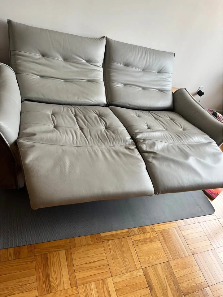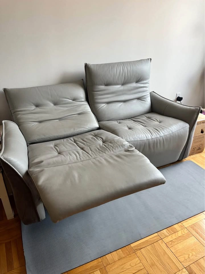 Gently used full leather electric recliner sofa in grey for sale. Seats 2 people very comfortably (up to 4 pax) and features an electric reclining function via button control. Measures about 180cm x 94cm. Bought and shipped from Singapore, so an adapter is required (standard travel adapter is compatible). Available for self-collection in FiDi.