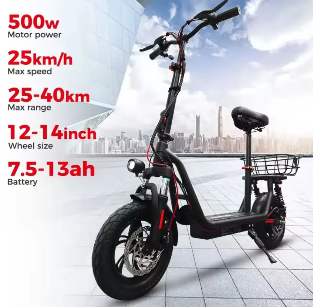 Black electric scooter. Features 500w motor, 25km/h max speed, 25-40km max range, 12-14 inch wheels, and 7.5-13ah battery. Includes a seat and front basket.