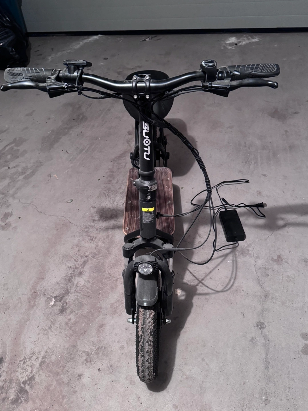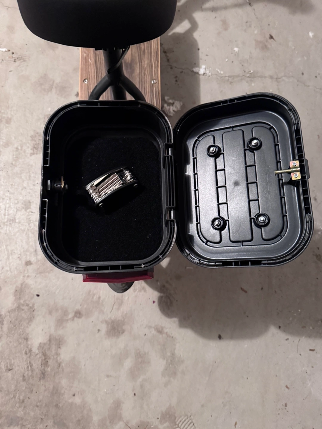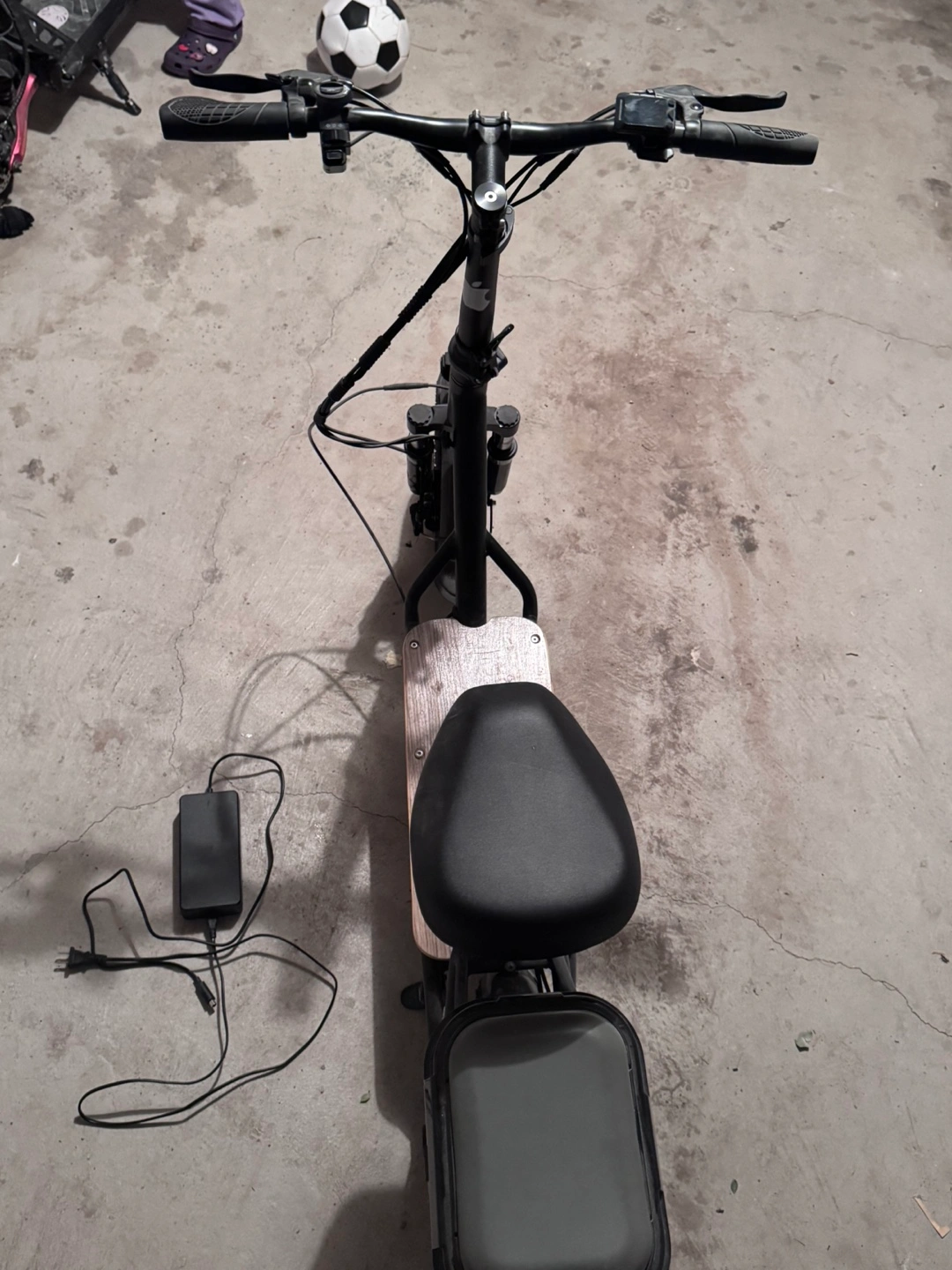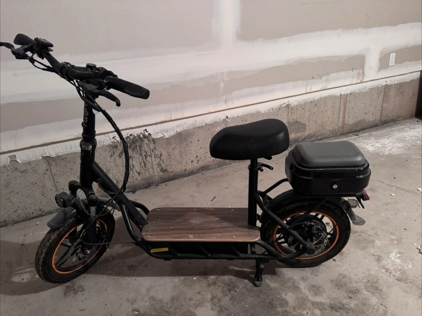 Black frame. Wooden deck. Seat and storage box. The lights will provide visibility for your rides.
