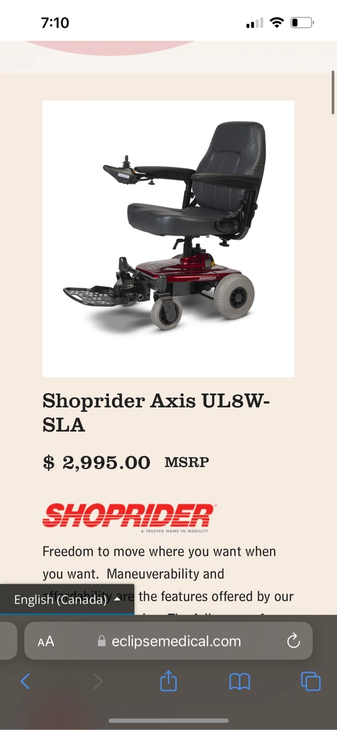 95Selling a Shoprider Axis power wheelchair that is only like 6 months old it has not even seen outside yet it’s still brand new. If you need a mobility item please let me know and I would be more than happy to help you.