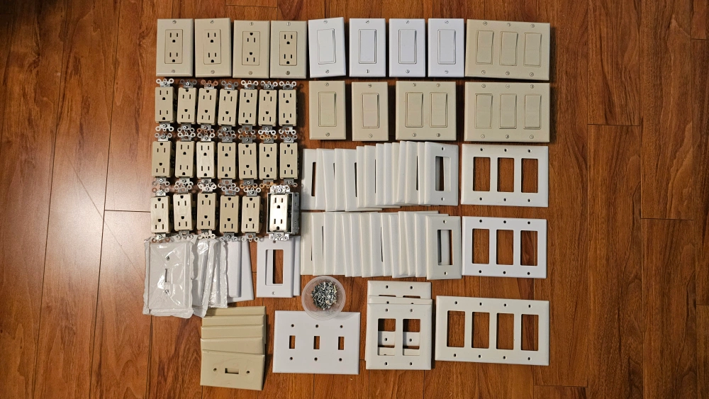 Selling a variety of electrical outlets and switch plates. There's a mix of single, double, and triple gang switch plates, along with standard outlets. Perfect for renovations or stocking up!
