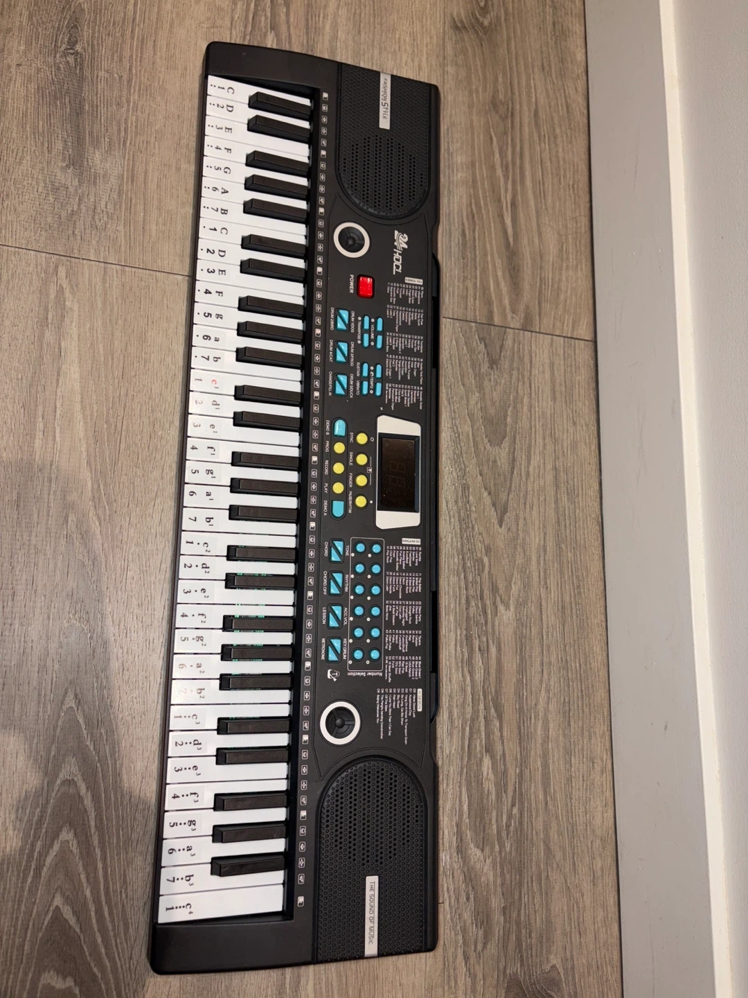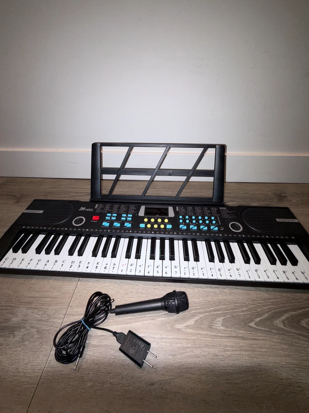 81Selling an electronic keyboard that's in perfect condition. It comes with a microphone and a power adapter. It's perfect for anyone who wants to learn to play or just have some fun making music Keys have removable notes stickers