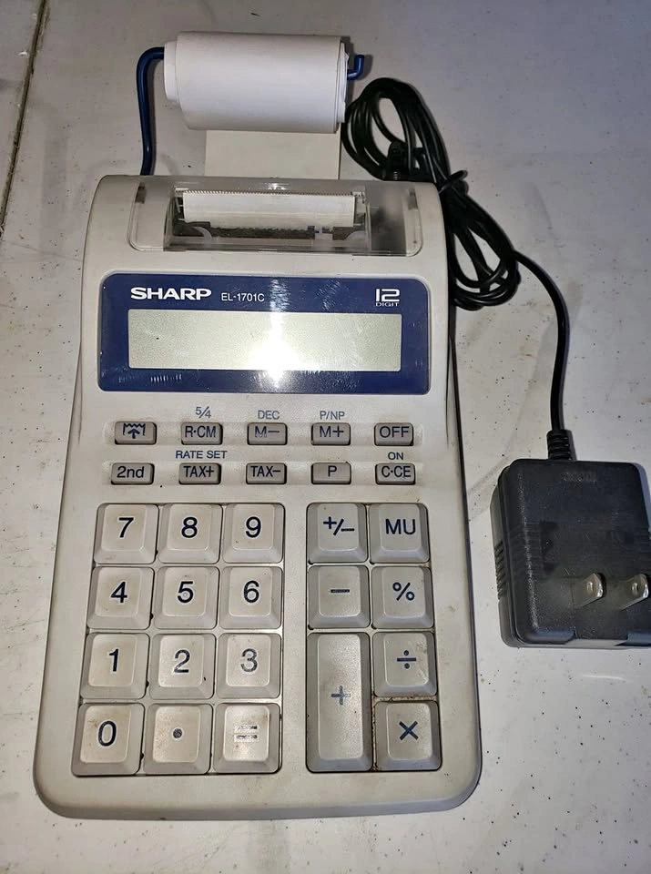 10Sharps EL-1701C electric calculator with paper roll. Works with 4 AA batteries too. Works perfectly