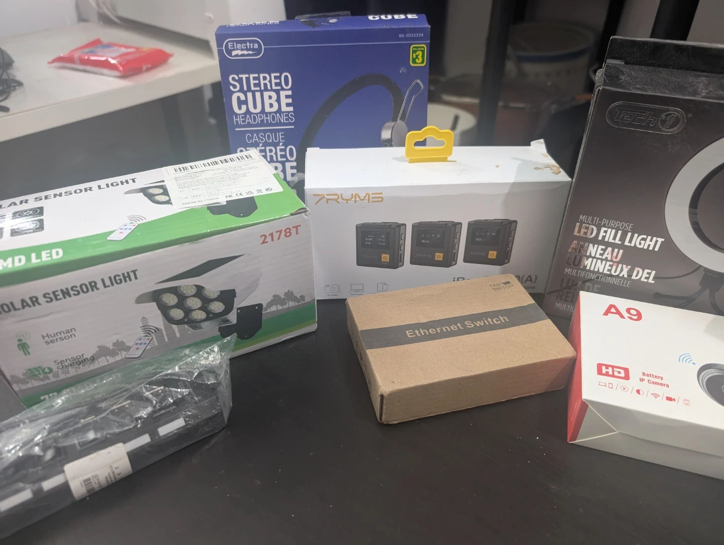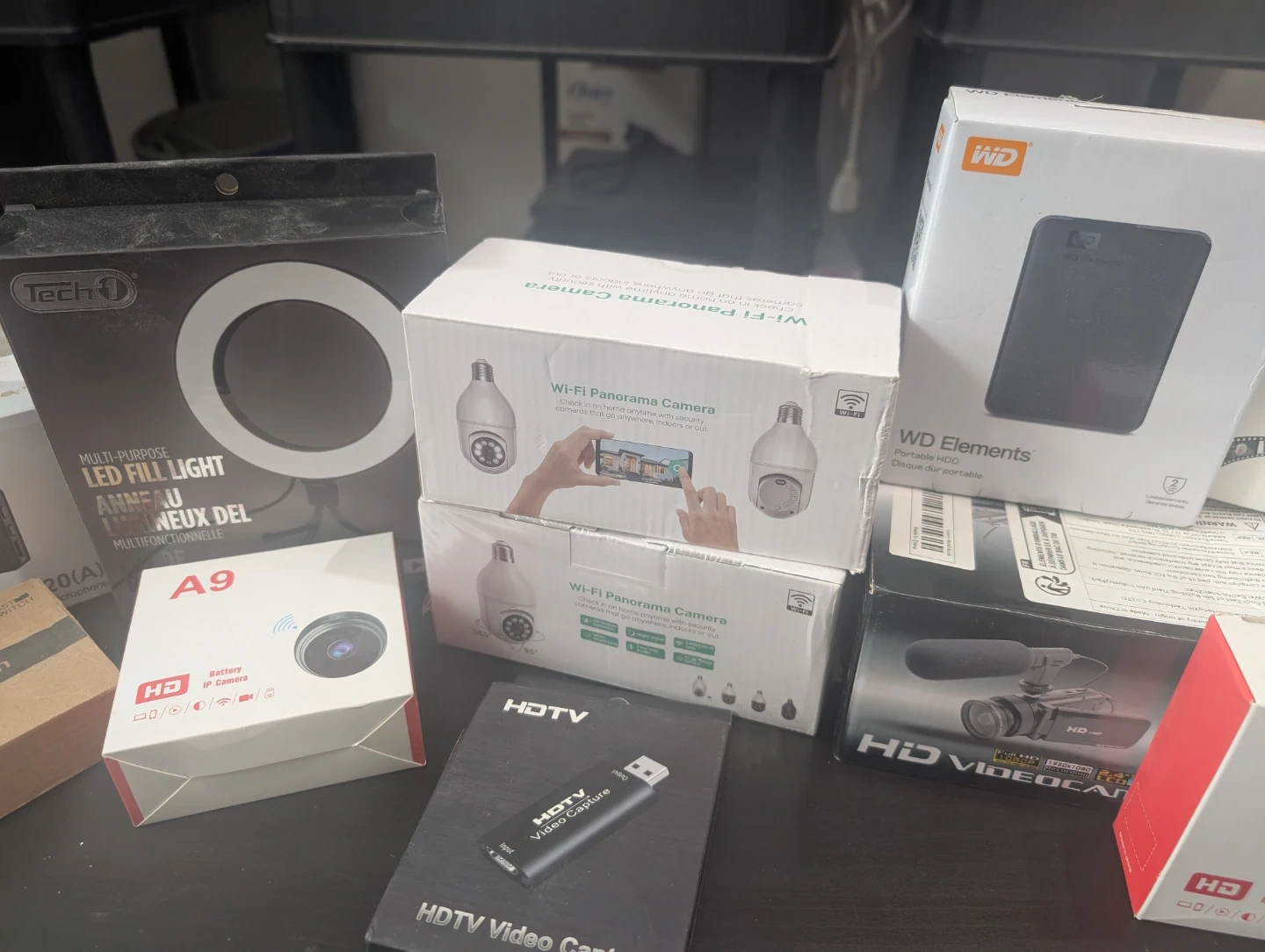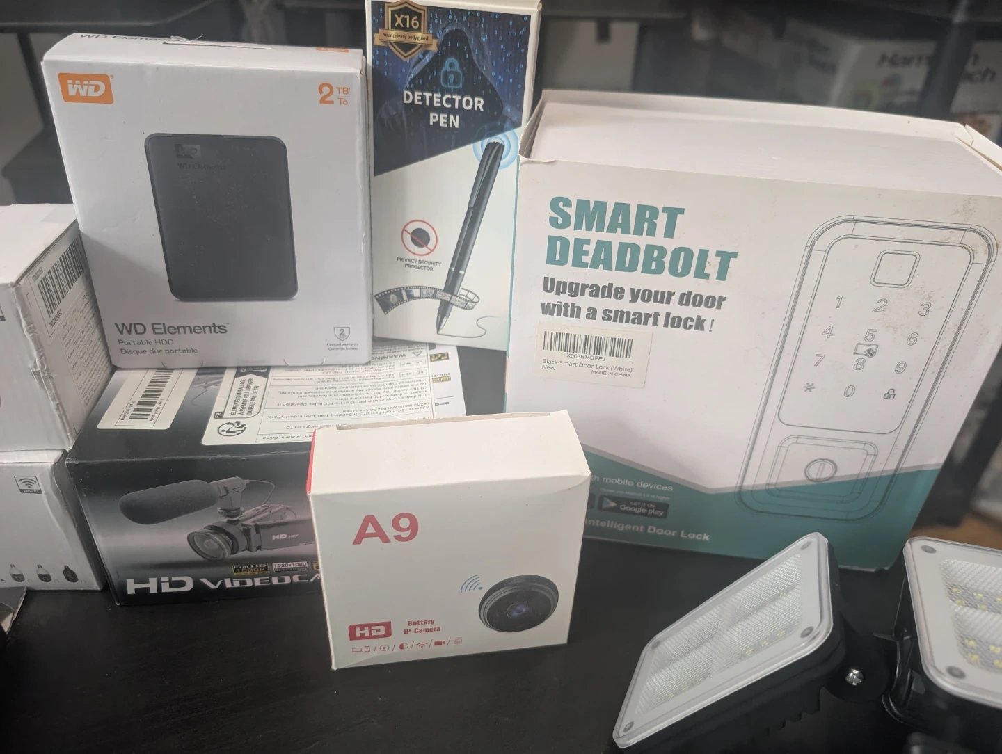 116Electronics bundle - led fill light, smart deadbolt lock, wireless microphone, sensor lights, solar UV lights, detector pen, wifi panorama cameras and more!!! It all needs to go. There are over 60 items included in the bundle.