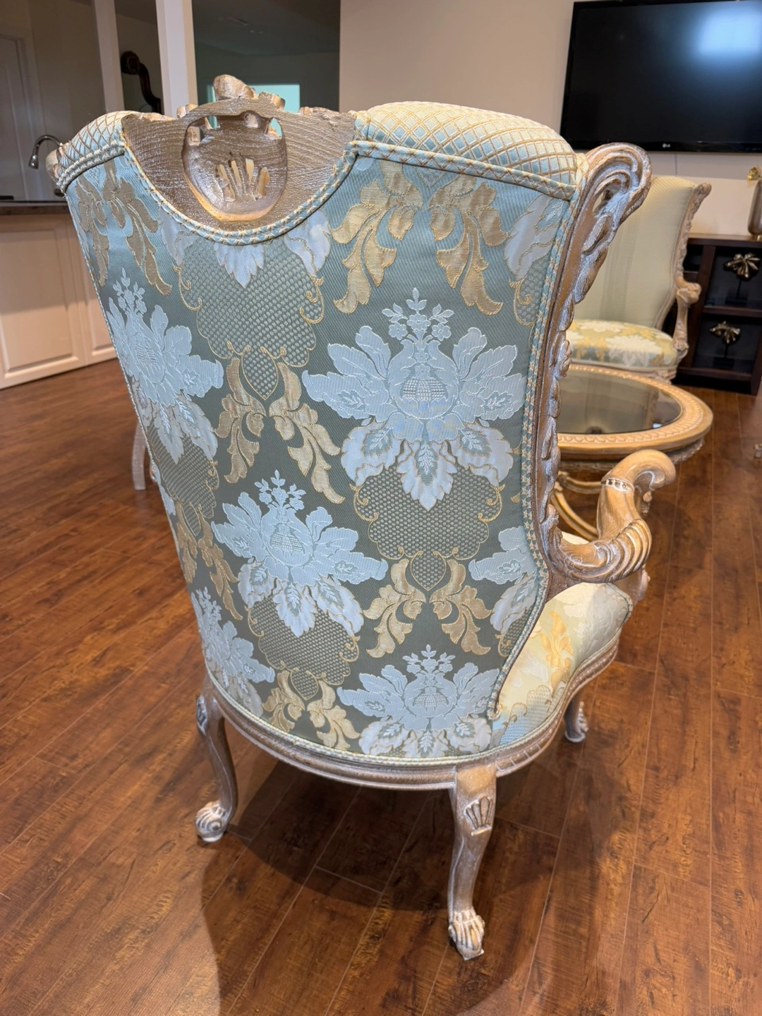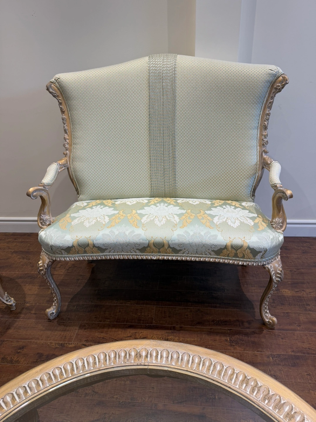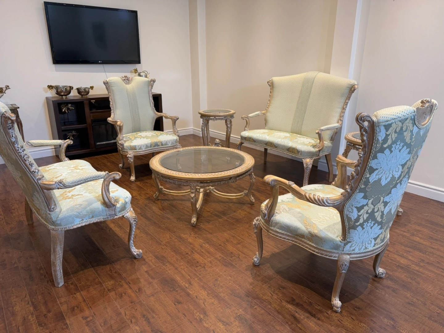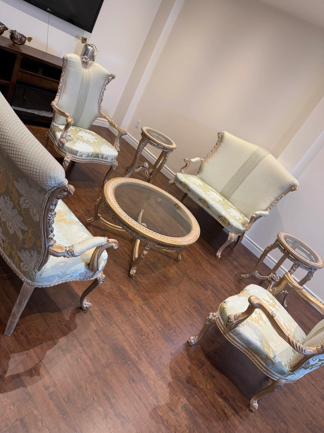 14This stunning living room set exudes luxury and sophistication. Featuring an intricately carved wood frame with a beautiful gold and silver leaf finish, this set is designed to impress. The light green and gold patterned upholstery adds a refined touch, perfectly complementing the ornate craftsmanship. The set includes two elegant armchairs, two stylish loveseat, and two matching side tables, and one coffee table making it a perfect addition to any formal living space. There is a matching dining table also in my others add.