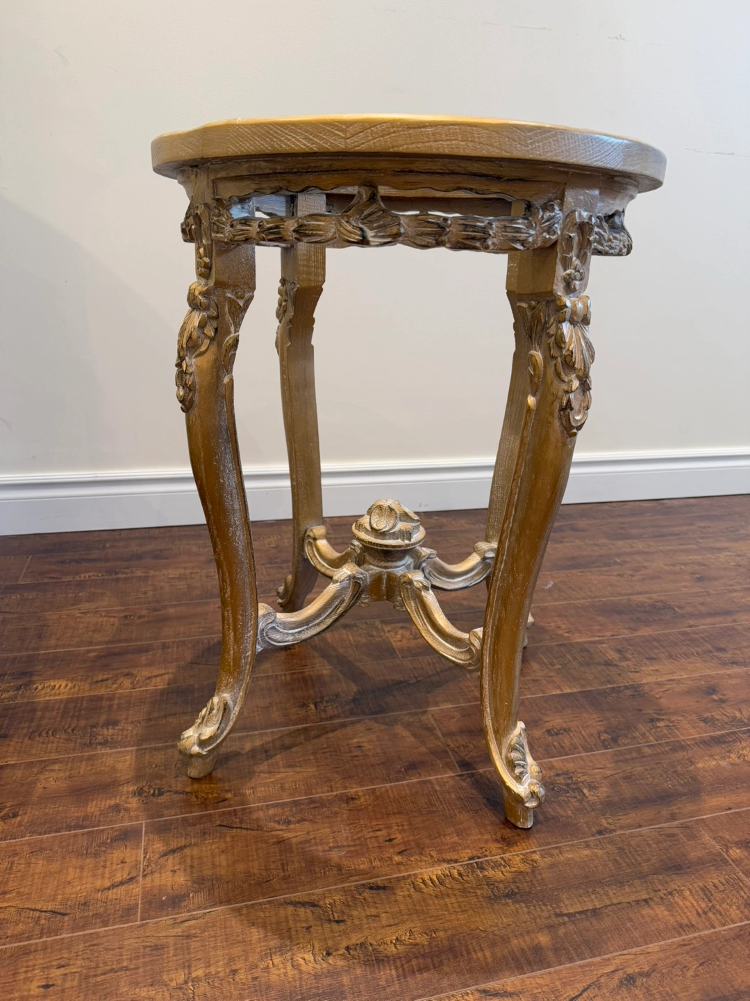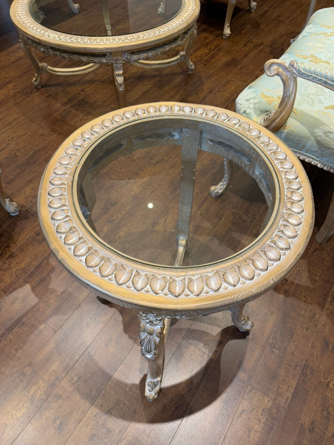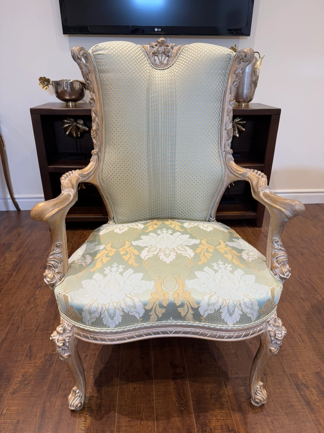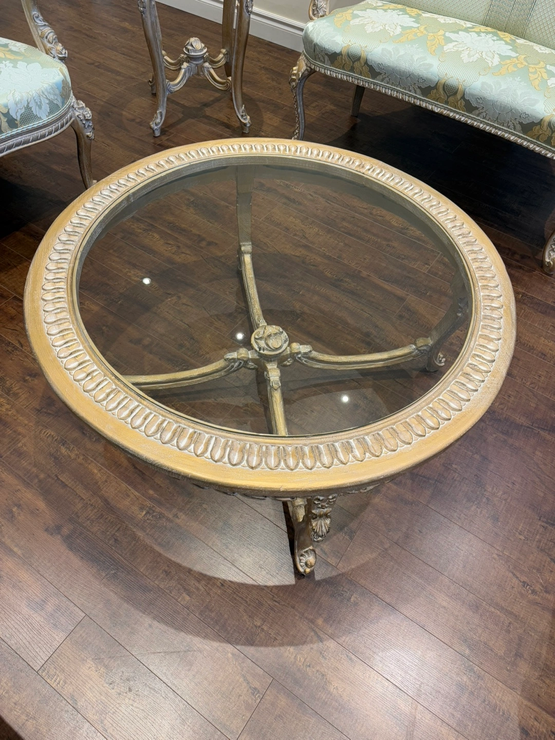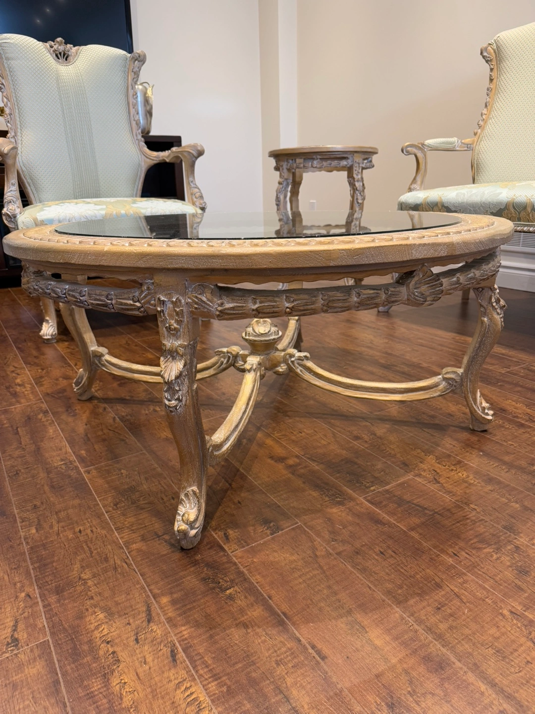 14This stunning living room set exudes luxury and sophistication. Featuring an intricately carved wood frame with a beautiful gold and silver leaf finish, this set is designed to impress. The light green and gold patterned upholstery adds a refined touch, perfectly complementing the ornate craftsmanship. The set includes two elegant armchairs, two stylish loveseat, and two matching side tables, and one coffee table making it a perfect addition to any formal living space. There is a matching dining table also in my others add.