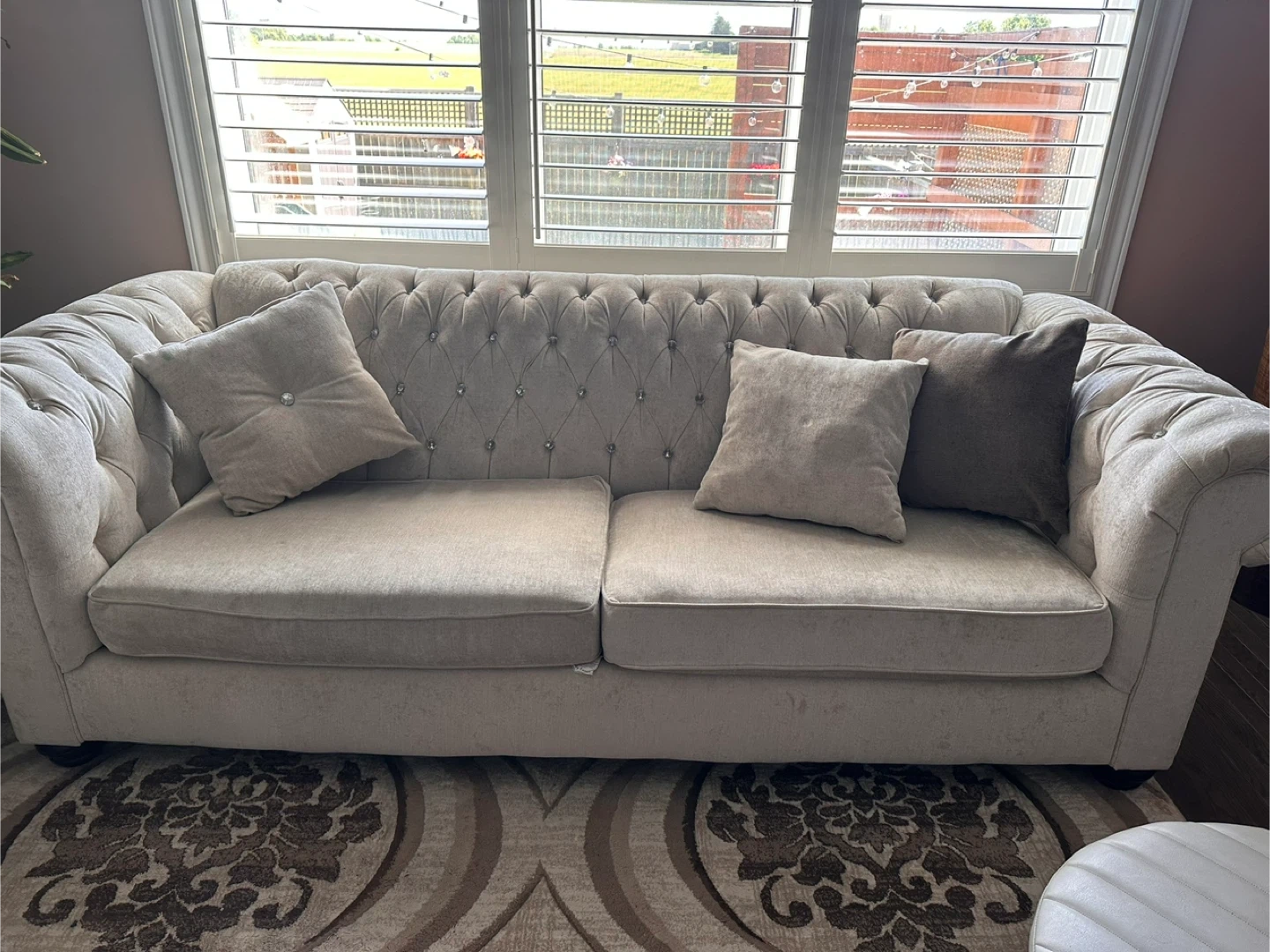 21Selling a beautiful beige Chesterfield sofa! It's in great condition and would add a touch of elegance to any living room. Gentle used sofa and love seat for sale! This comfortable piece of furniture has been well-maintained in a smoke- and pet-free environment. It's in very good condition and ready for its new home. Please note that this is a pick-up only sale, and the buyer will be responsible for transportation. If you're interested, send me a message!