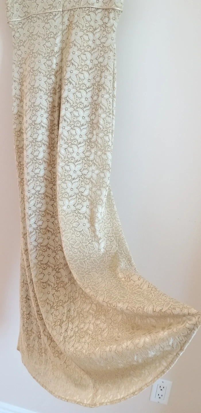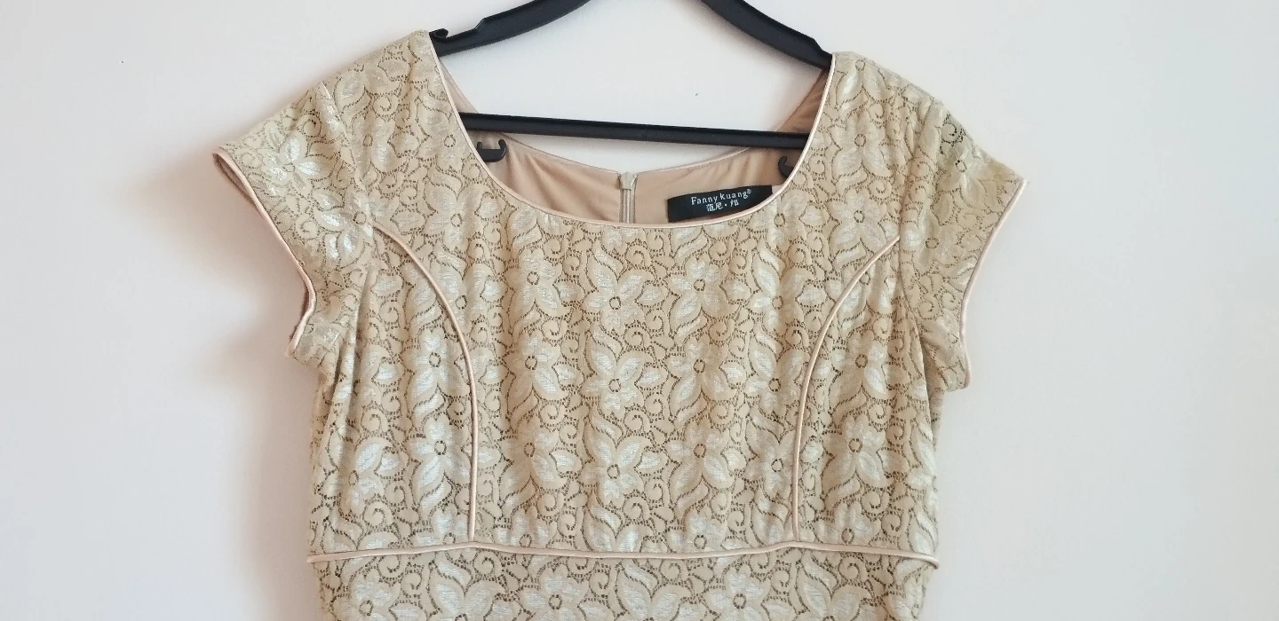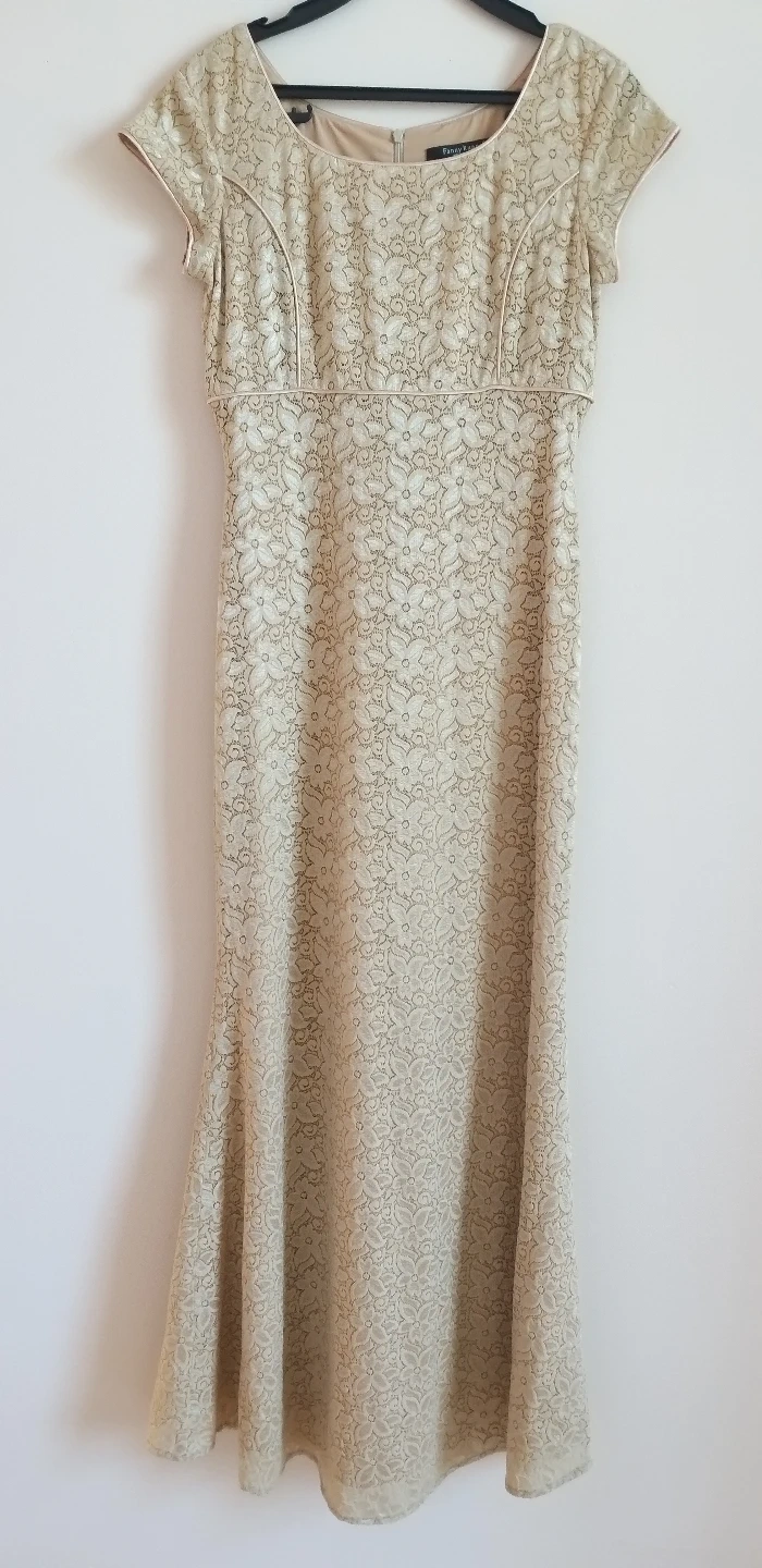 Beautiful beige midi dress. Features short sleeves, a fitted bodice, and a flared skirt. Floral lace detailing throughout. Back zipper closure.