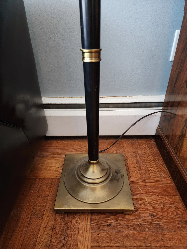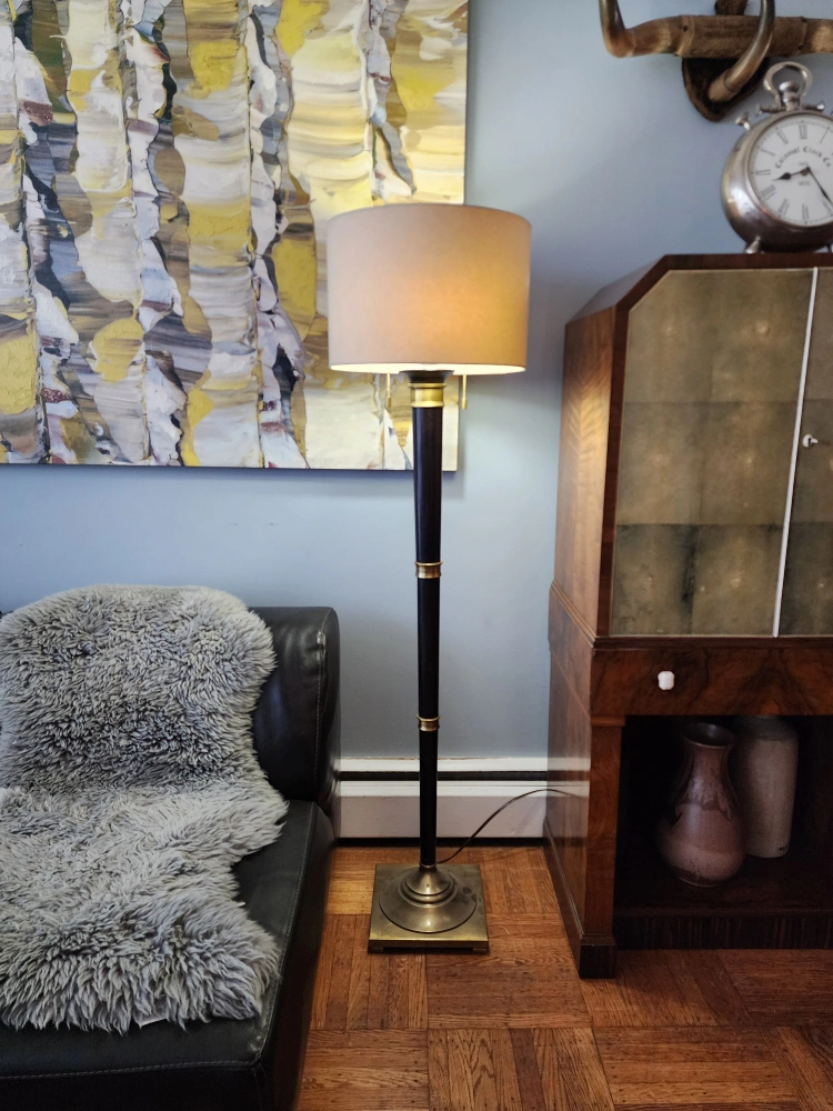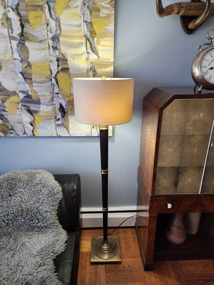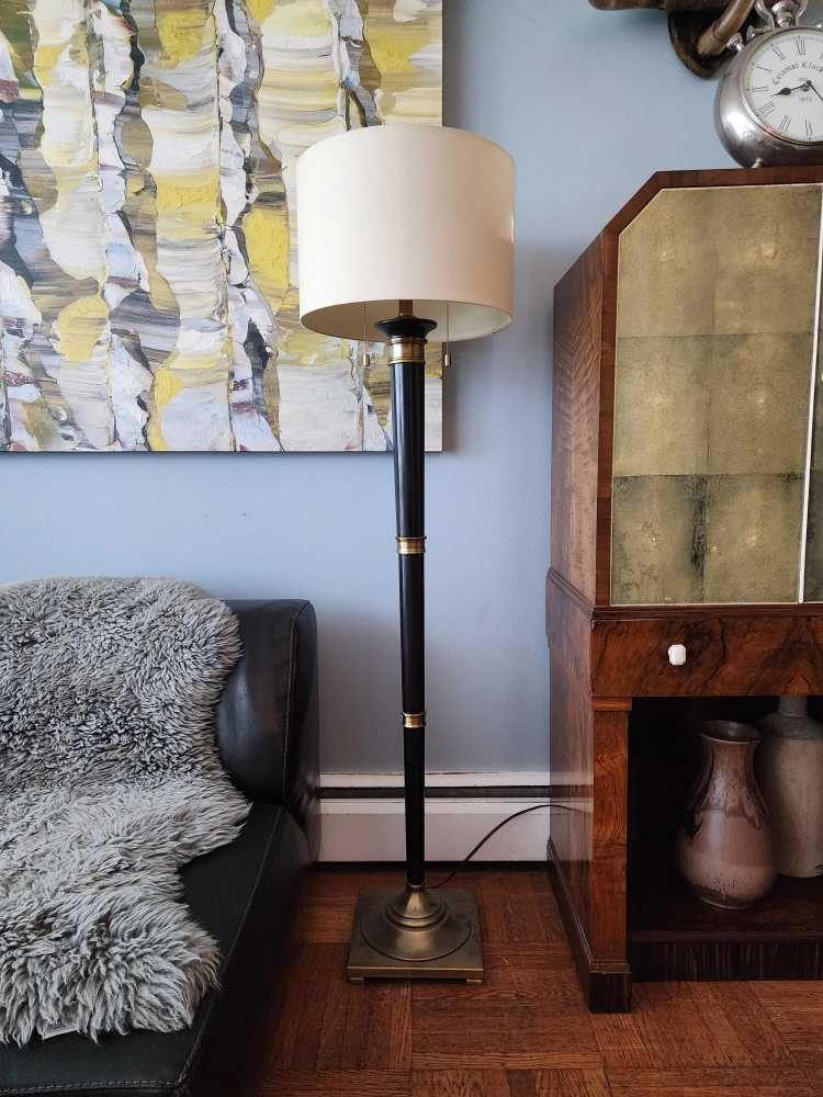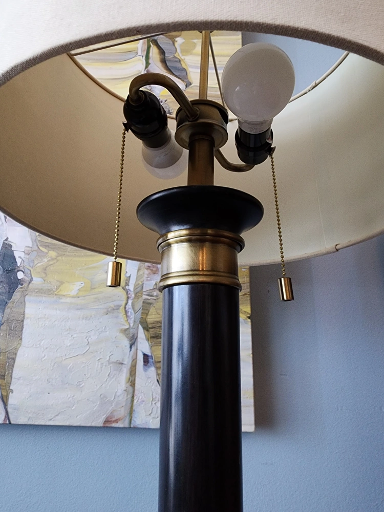 99Tall floor lamp. Black column with brass accents. Square brass base. Beige drum shade. Two-light fixture. Pull chains.