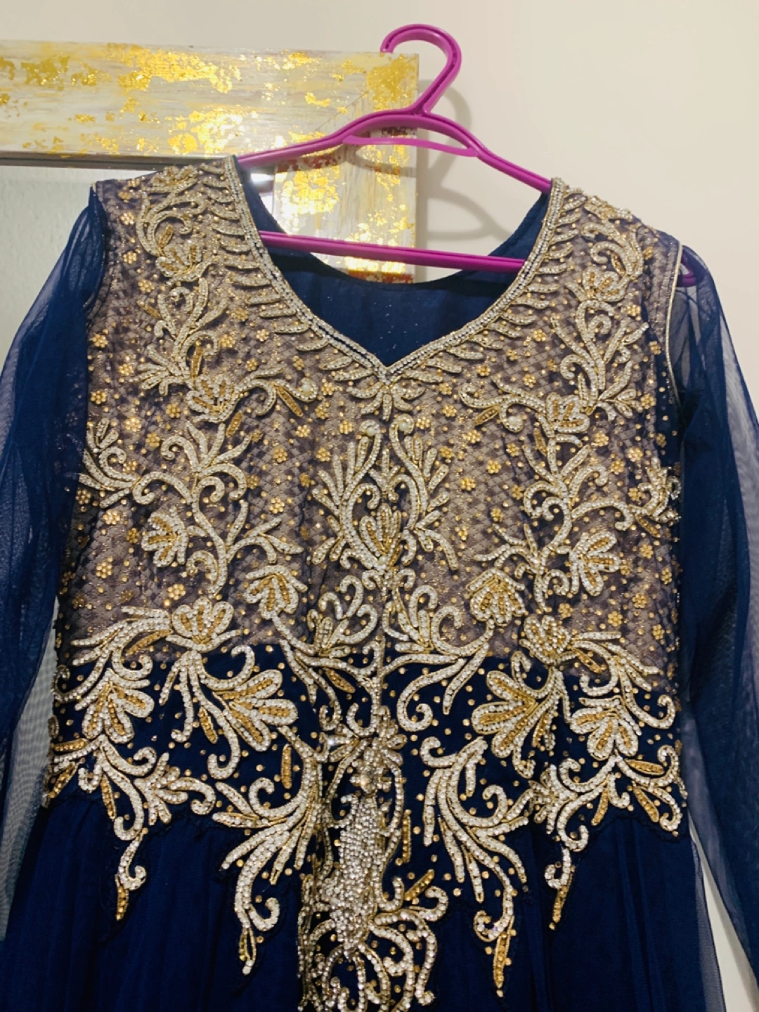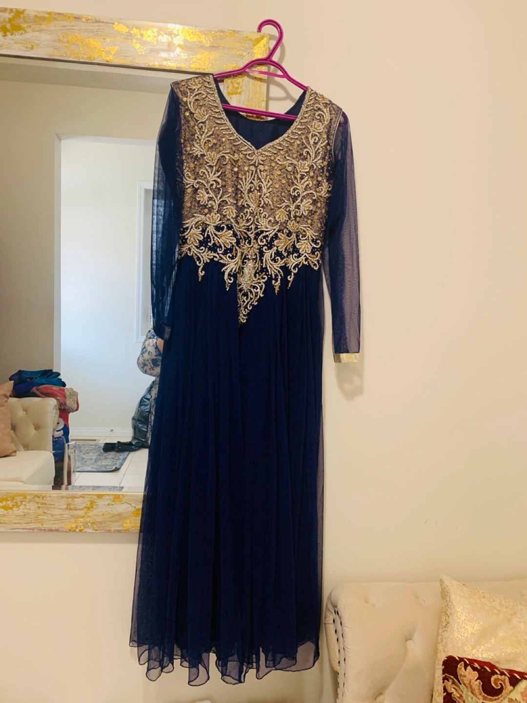 Beautiful dress with intricate gold embellishments! The dress is a lovely shade of blue and features long sleeves. Perfect for a special occasion or event. It has a unique design that is sure to turn heads