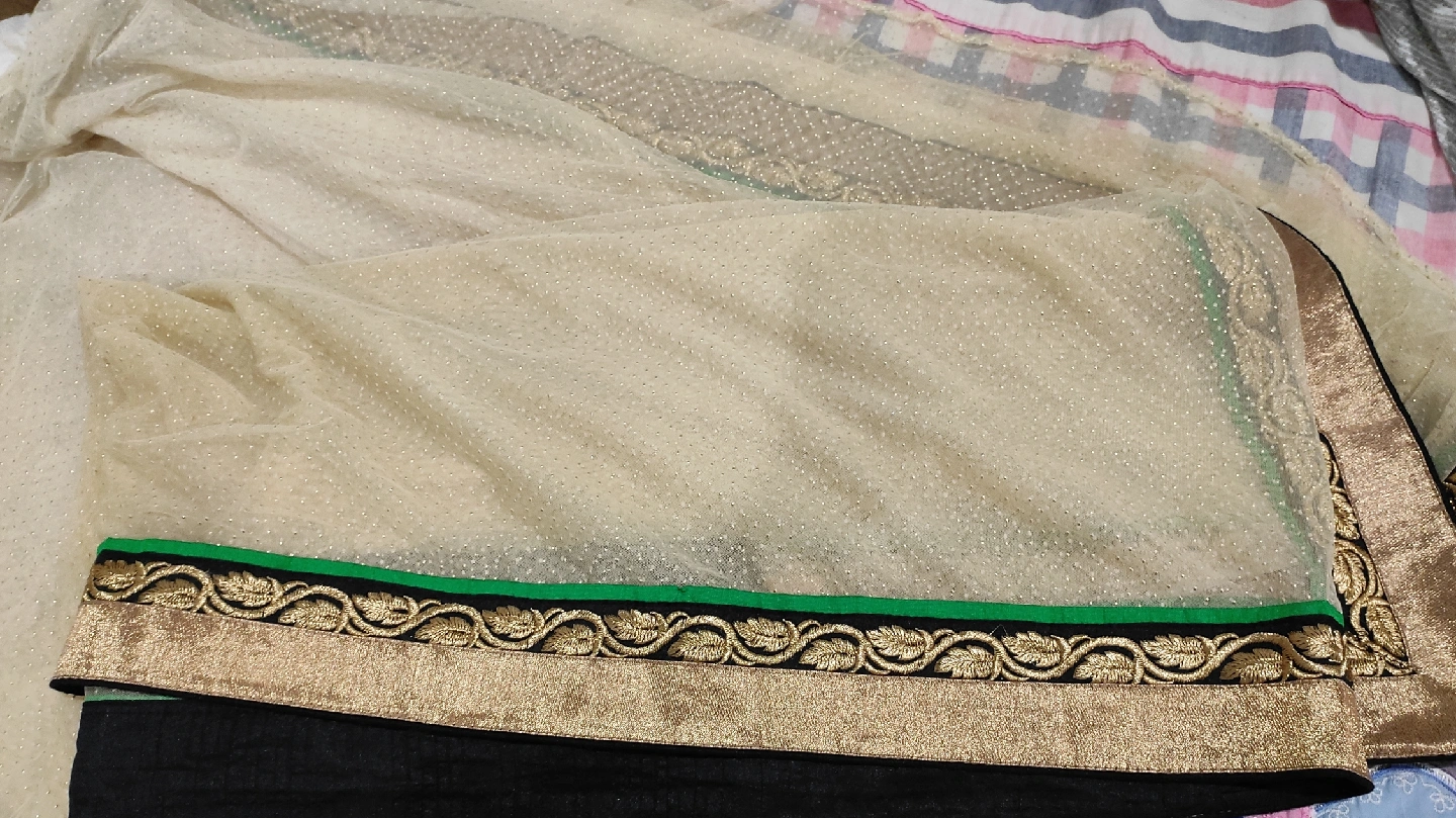 Beautiful sari in cream with a delicate dotted pattern. Features a striking gold and black border with a touch of green. Perfect for a special occasion or adding a touch of elegance to your wardrobe