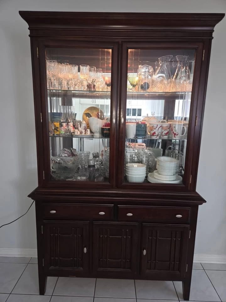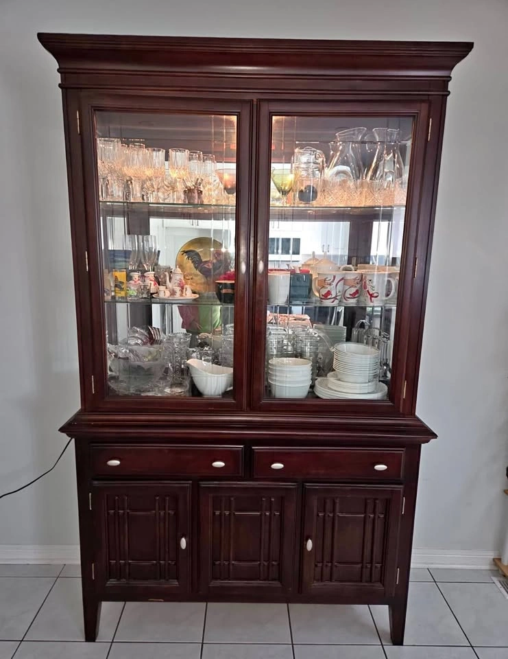 Add charm and functionality to your home with this beautifully crafted full-size hutch. Perfect for showcasing your finest glassware or storing everyday dining essentials, this piece blends classic design with practical storage. Features: - Rich dark wood finish that complements any décor - Glass-front upper shelves to display wine glasses, mugs, bowls, and more - Three spacious drawers and three lower cabinets for hidden storage - Solid construction with a timeless look – built to last - Ideal for dining rooms, kitchens, or even as a stylish bar setup Dimensions: Height - 80" x Length - 50" x Depth - 23.5" Asking Price: $200 Negotiable Message me if you're interested or have questions.
