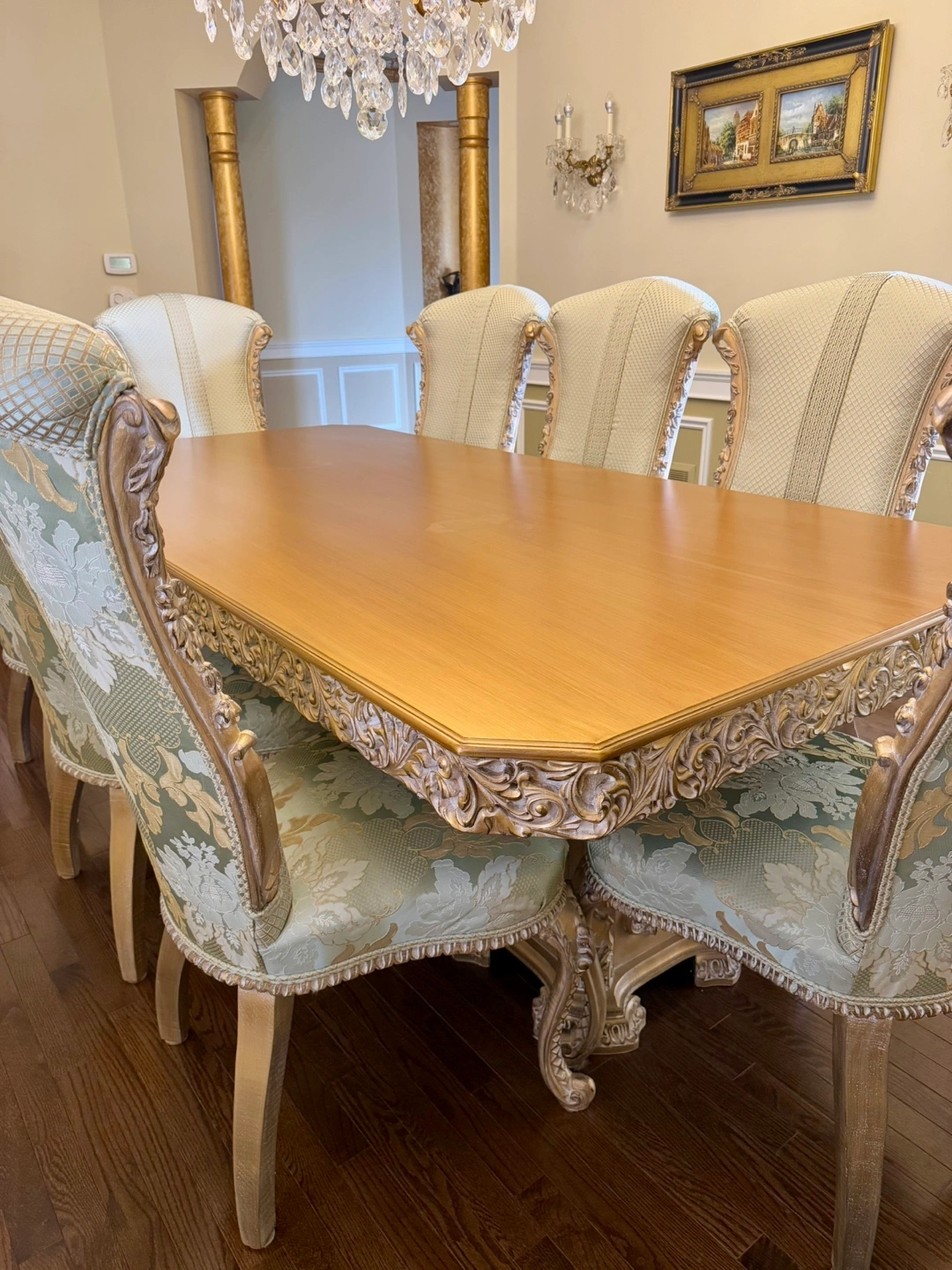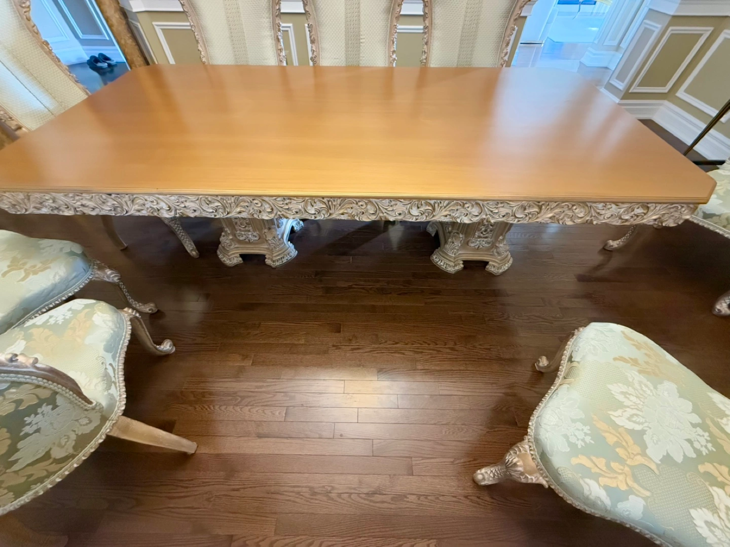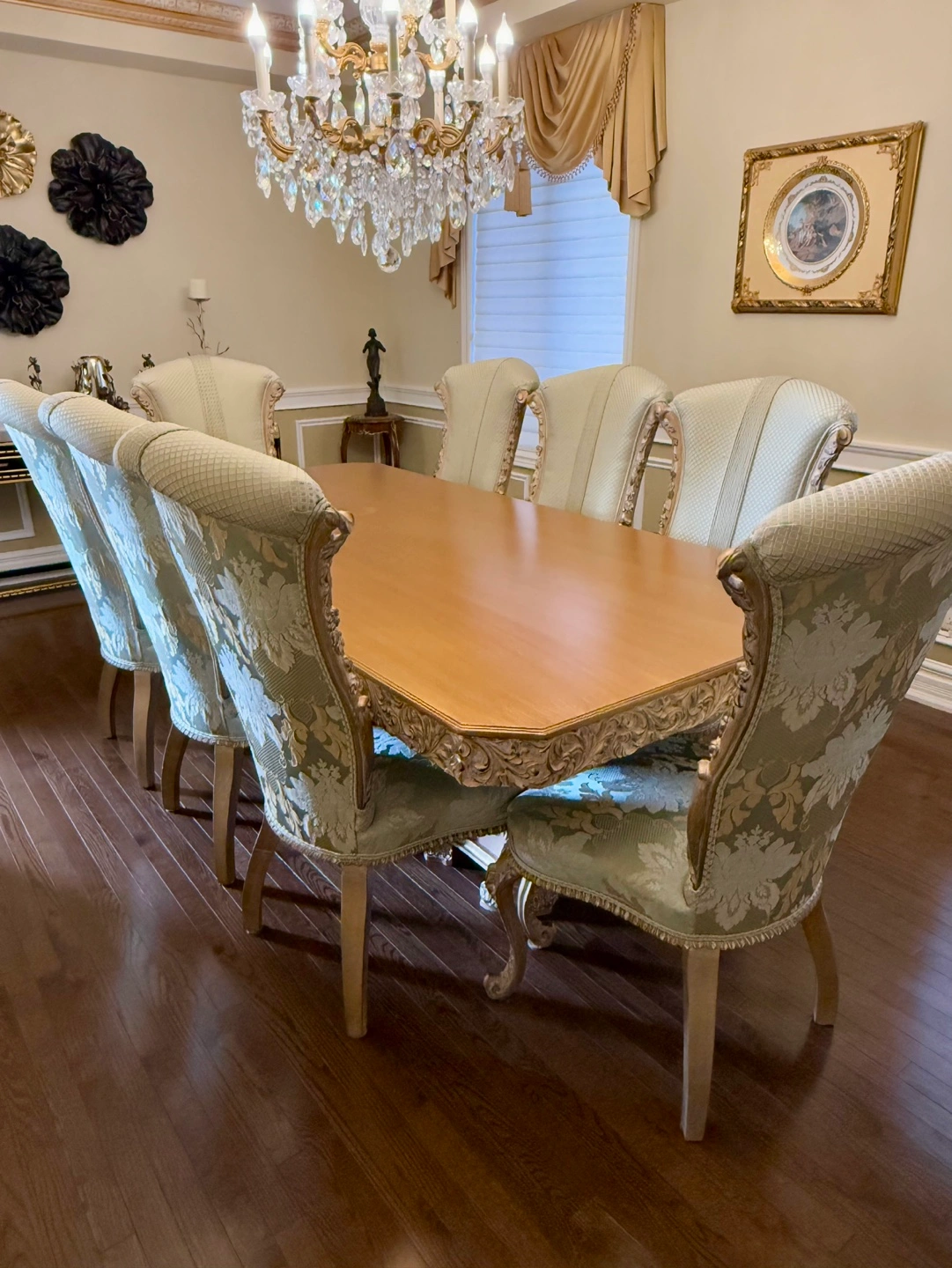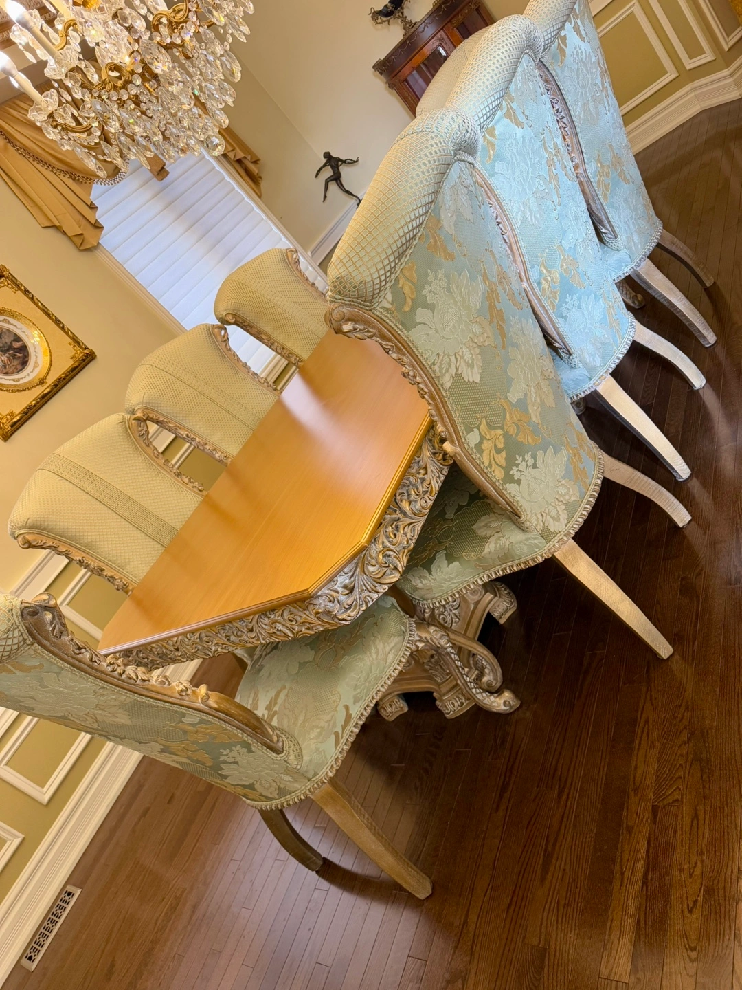 14Enhance your dining space with this stunning formal dining set. The beautifully crafted table features a light wood tabletop with intricate carvings on the legs, adding a touch of timeless elegance. Accompanying the table are eight matching chairs, upholstered in a sophisticated light green fabric that perfectly complements the set’s ornate design. This high-quality dining set is perfect for hosting gatherings and special occasions, making it a luxurious addition to any formal dining room.