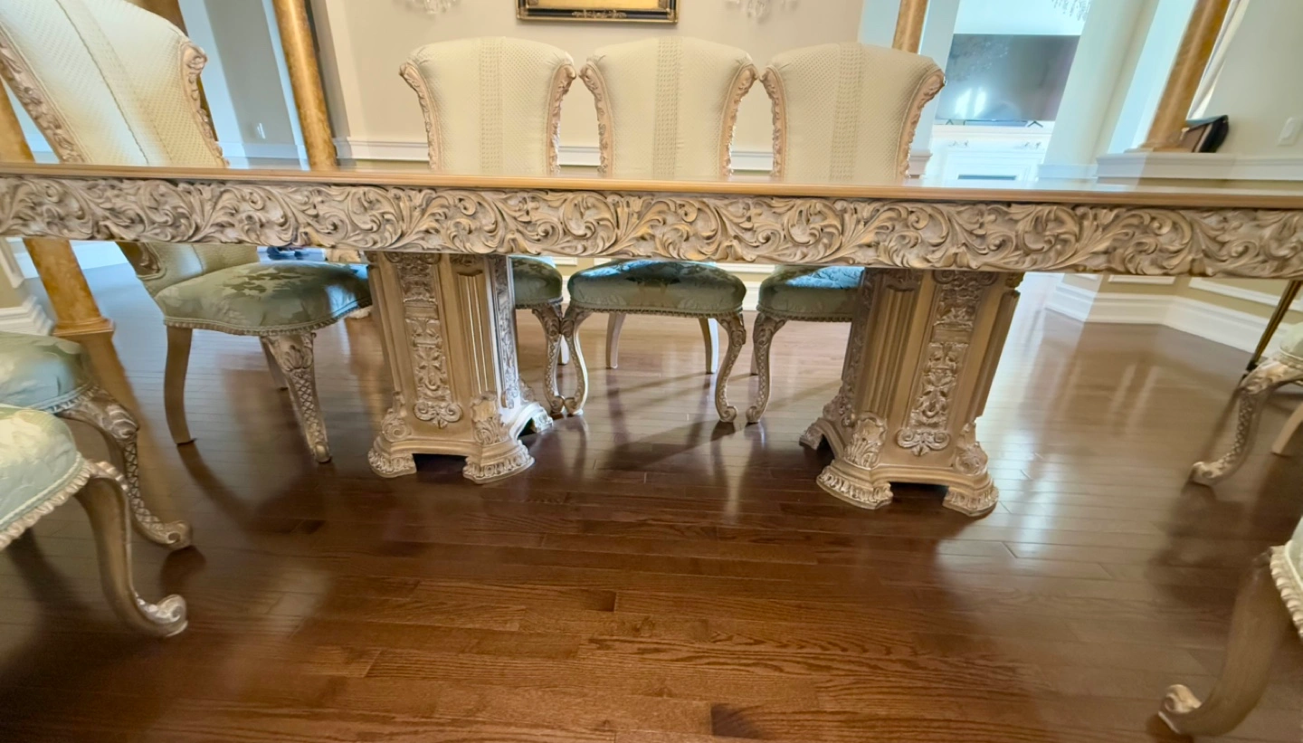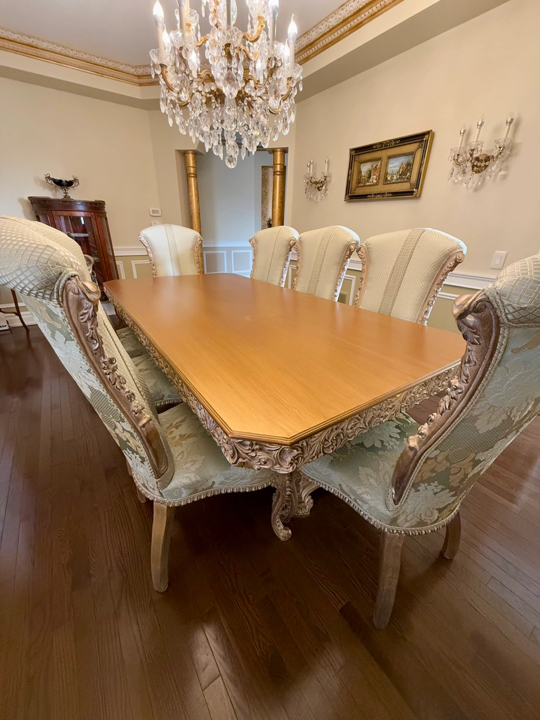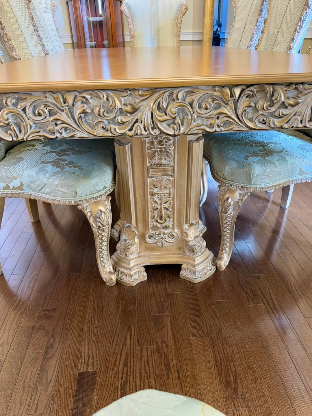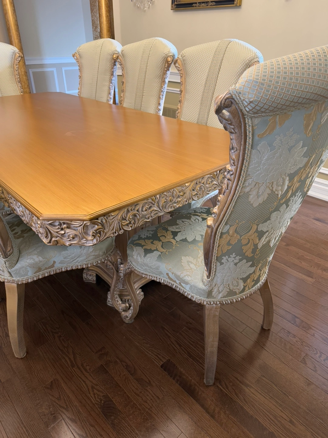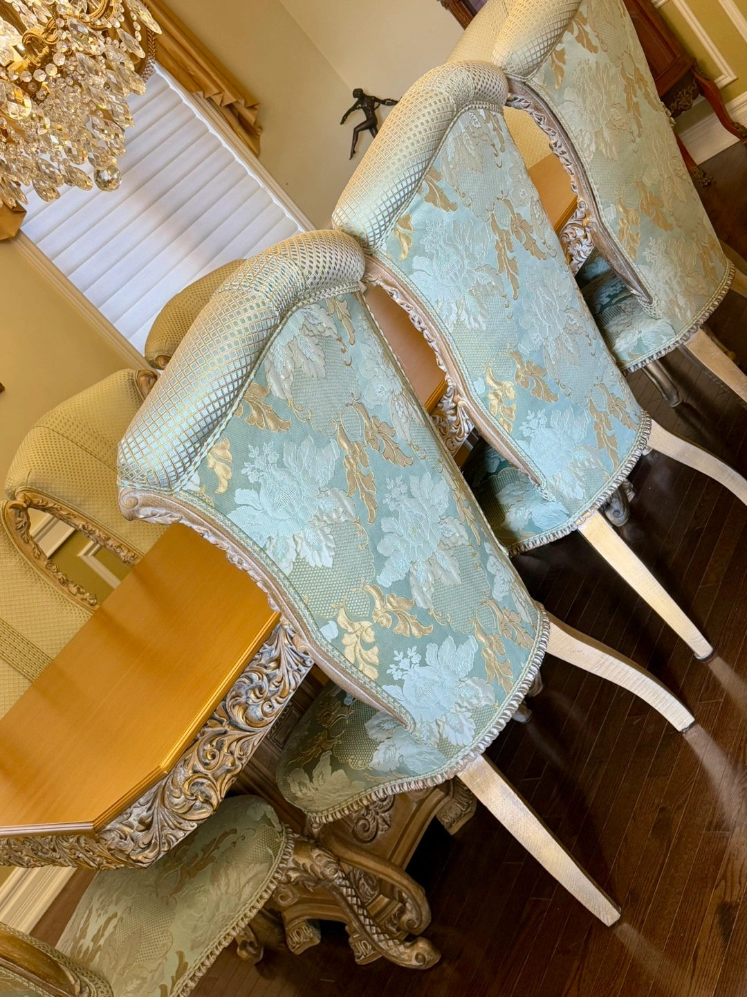 14Enhance your dining space with this stunning formal dining set. The beautifully crafted table features a light wood tabletop with intricate carvings on the legs, adding a touch of timeless elegance. Accompanying the table are eight matching chairs, upholstered in a sophisticated light green fabric that perfectly complements the set’s ornate design. This high-quality dining set is perfect for hosting gatherings and special occasions, making it a luxurious addition to any formal dining room.