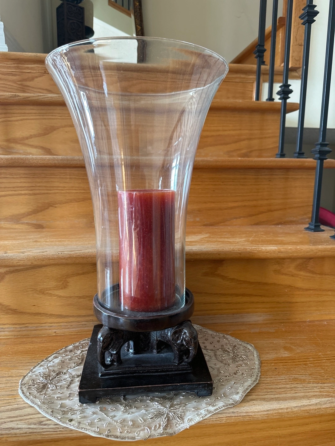 5Tall clear glass hurricane candle holder. Dark brown wooden base features four elephant figurines. Holds a pillar candle.