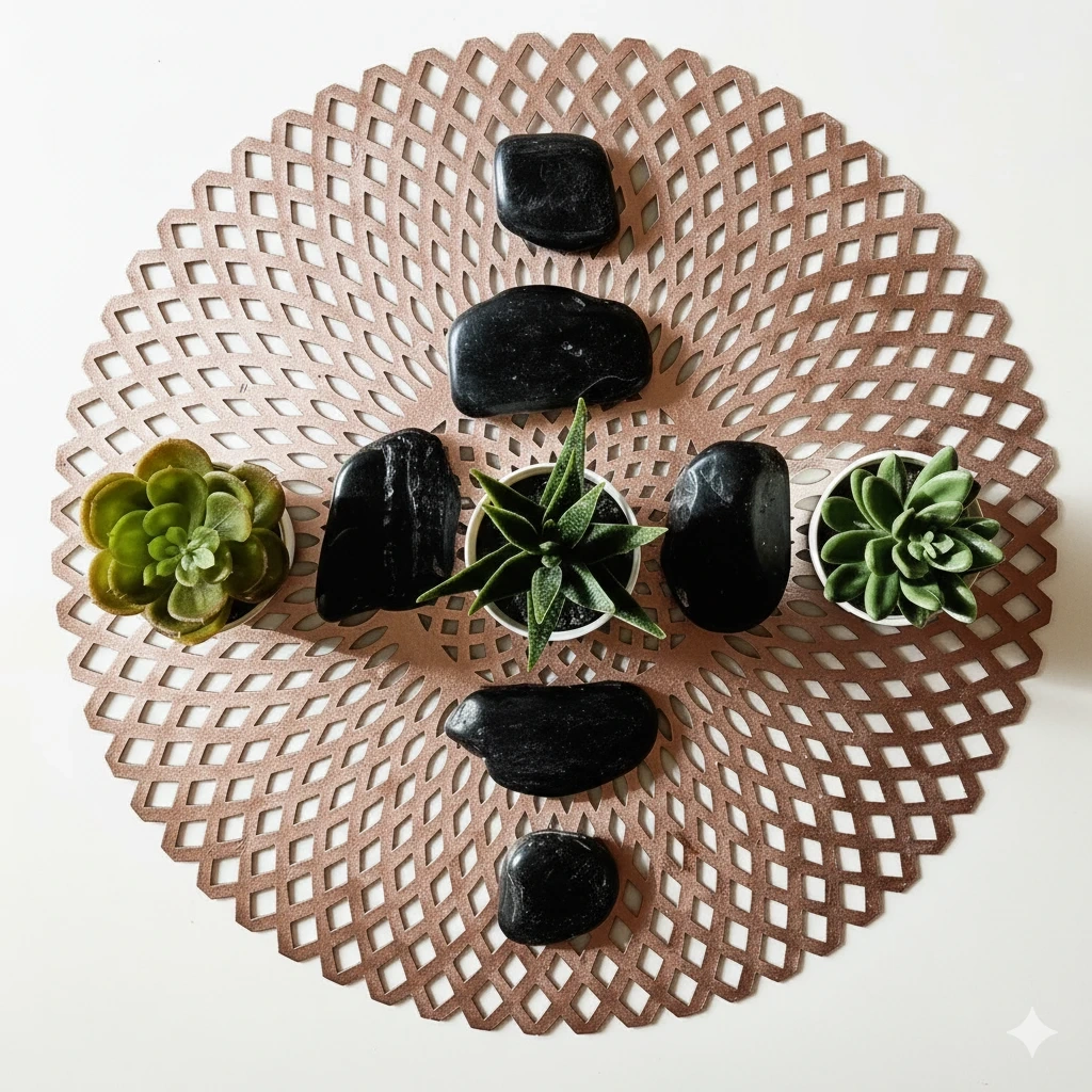 1000+Elegant Home Decor ✨️ One circular synthetic material, golden in matte finish, featuring six black polished stones and three IKEA artificial plants, creates an artistic and affordable home decor. From a smoke-free, pet-free home. Bundle discounts are available—feel free to browse my other listings. Thanks for looking! 😊🙏