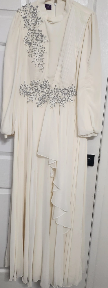 Floor-length maxi dress. Off-white colour. Features long sleeves and beautiful silver beading detail. Draped design.