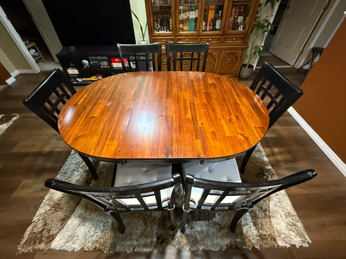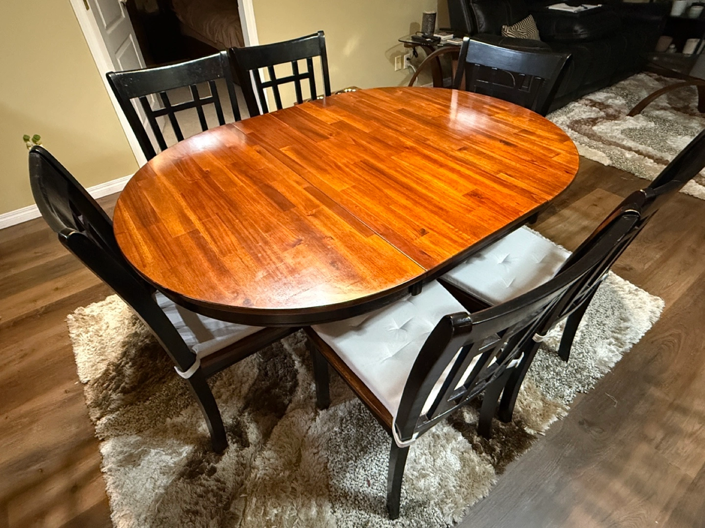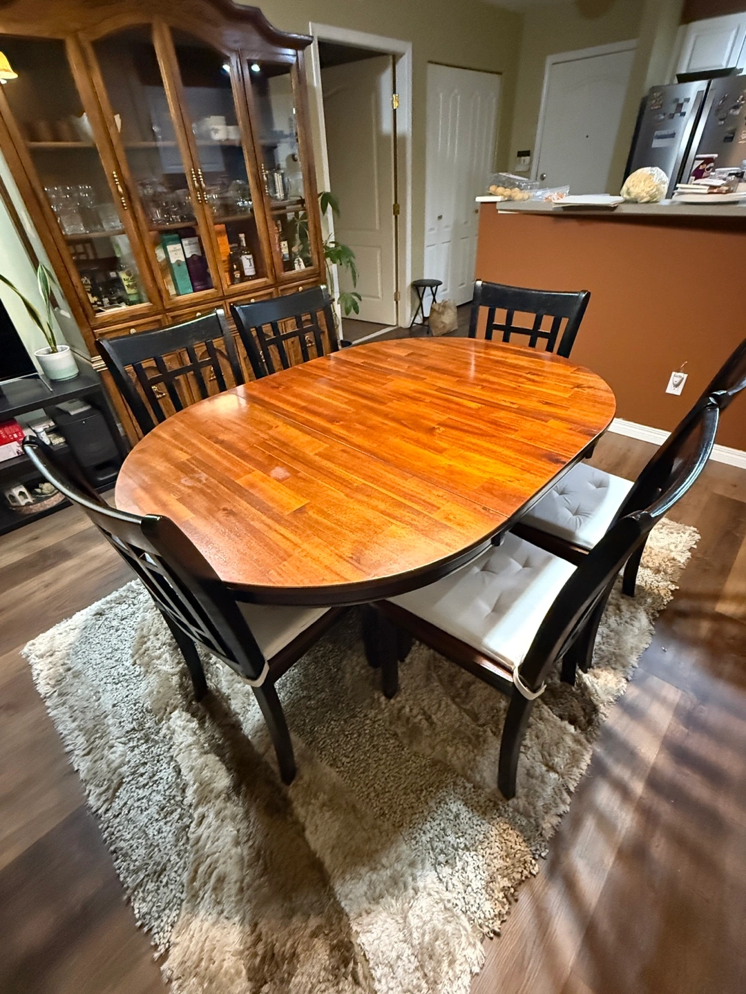Upgrade your dining space with this beautifully crafted solid wood oval dining set, designed for both style and functionality. This versatile table comfortably seats six but can be conveniently converted into a round four-seater for a cozier setting. High-Quality Solid Wood: Sturdy and durable with a rich, warm finish. Convertible Design: Easily transforms from a six-seater oval table to a round four-seater. Built-in Storage Rack: A practical shelf beneath the table for extra storage. Comfortable Seating: Comes with six matching chairs, each featuring elegant black frames and plush, button-tufted seat cushions. Well-Maintained: In excellent condition with minimal wear. Perfect for family gatherings or intimate dinners, this dining set combines classic charm with modern convenience. Condition: Gently used and in great shape, with a minor wear and tear on one side (as shown in last two photos) that can easily be covered with a corrective pen or polish. A great addition to any home!
