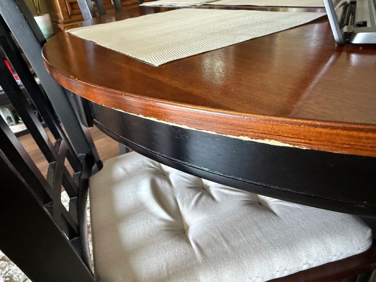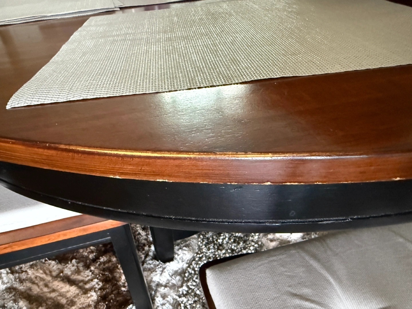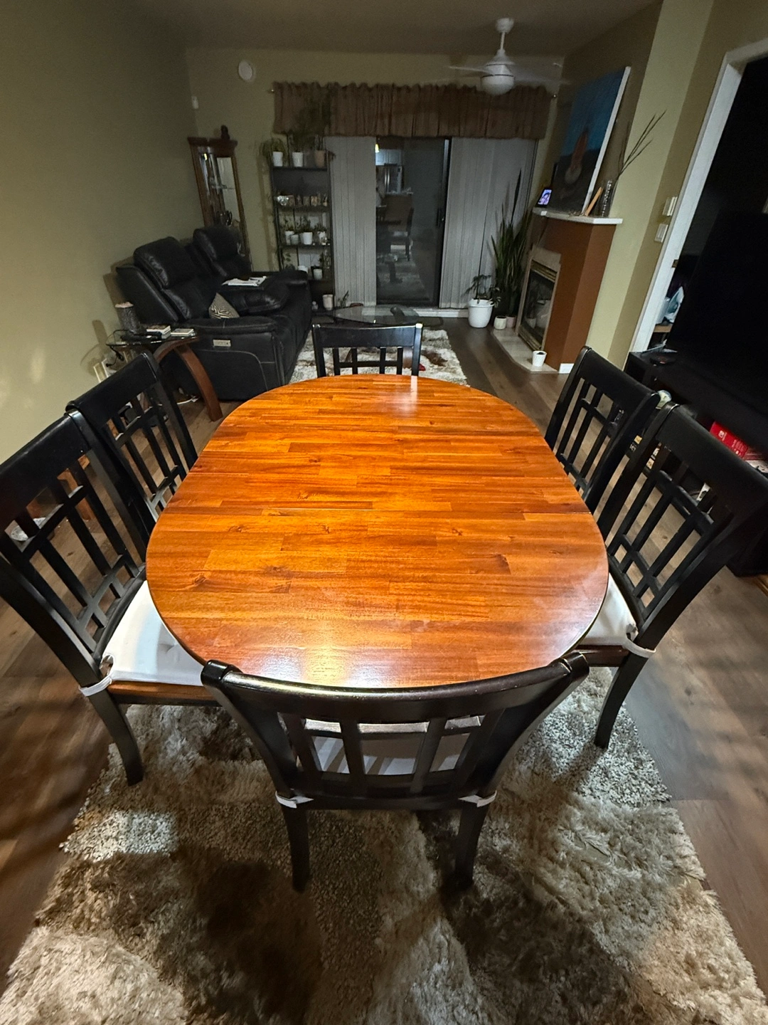 Upgrade your dining space with this beautifully crafted solid wood oval dining set, designed for both style and functionality. This versatile table comfortably seats six but can be conveniently converted into a round four-seater for a cozier setting. High-Quality Solid Wood: Sturdy and durable with a rich, warm finish. Convertible Design: Easily transforms from a six-seater oval table to a round four-seater. Built-in Storage Rack: A practical shelf beneath the table for extra storage. Comfortable Seating: Comes with six matching chairs, each featuring elegant black frames and plush, button-tufted seat cushions. Well-Maintained: In excellent condition with minimal wear. Perfect for family gatherings or intimate dinners, this dining set combines classic charm with modern convenience. Condition: Gently used and in great shape, with a minor wear and tear on one side (as shown in last two photos) that can easily be covered with a corrective pen or polish. A great addition to any home!